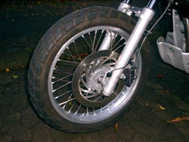 Тут же после съезда с авто-бана - светофор! Резко переключается на красный. Вынужденое и почти экстренное торможение. Заднее колесо не реагирует на тормоз, переднее колесо тормозит отлично, но резина не шосейная и по этому начинает проскальзывать по мокрому асфальту - это чувствуется. ABS помогает в таких ситуациях.