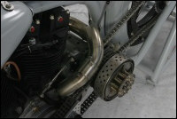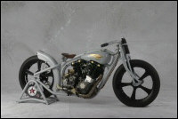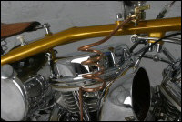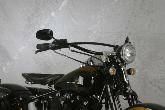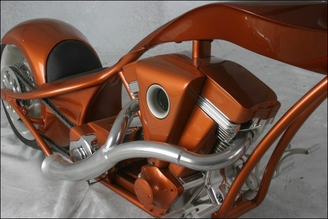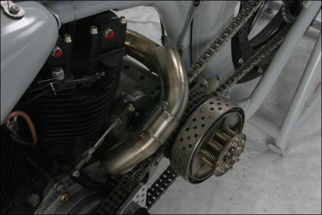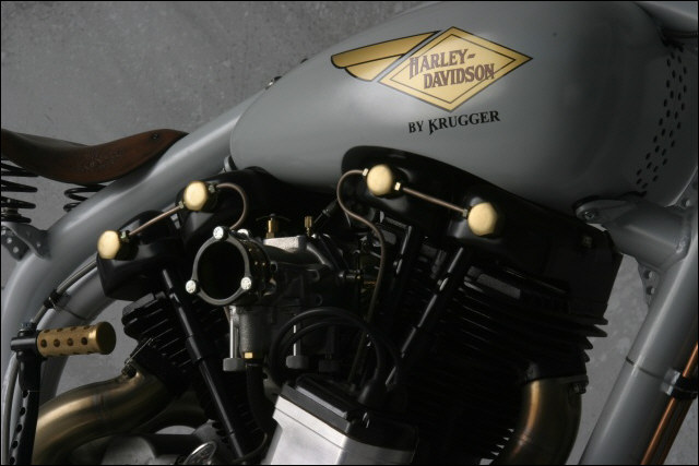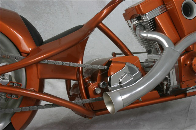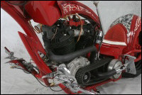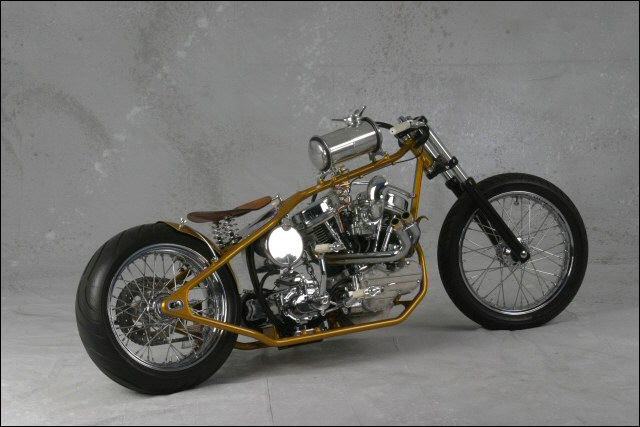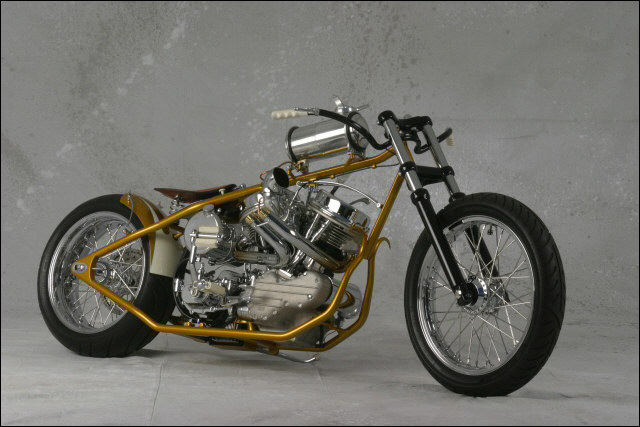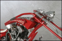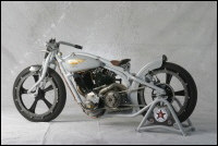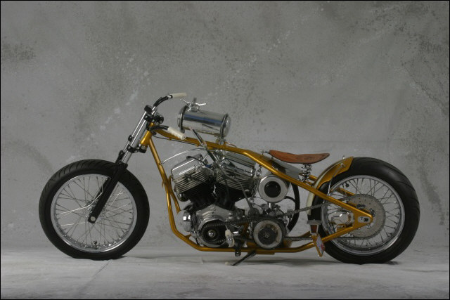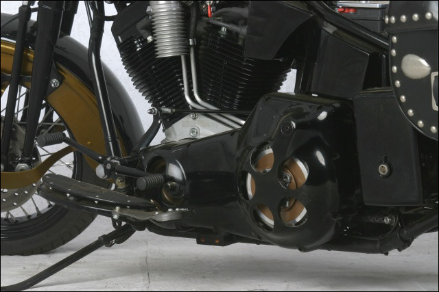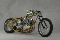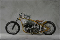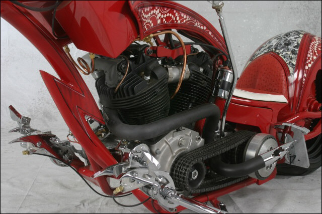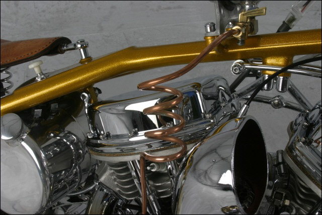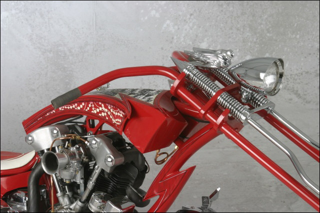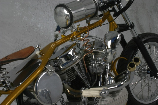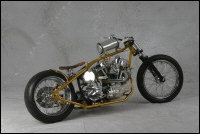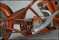 Chain link down tube, custom clutch & shifter arm, jetski style throttle, headlight mounted down by primary, chain primary-open, custom exhaust. Mooneyes custom gas tank, electronics hidden in false generator cover, Schwinn style bars, grips and pedals. Mid controls via V-Rod, Lantern taillight, tooled seat, hidden battery and more!