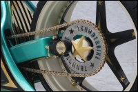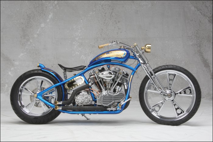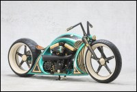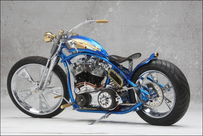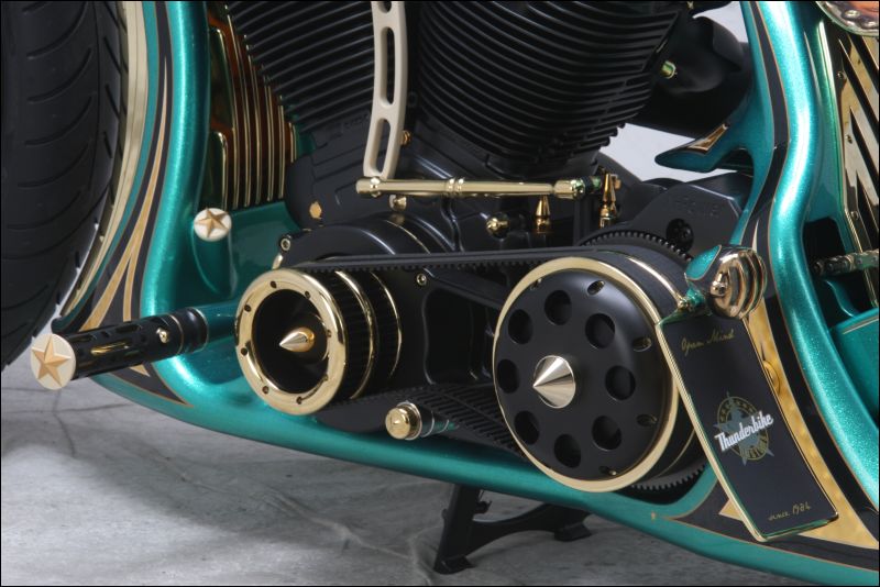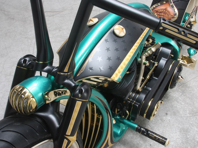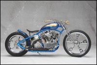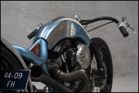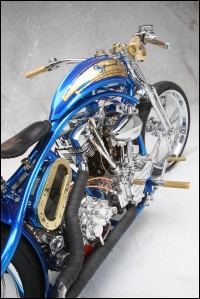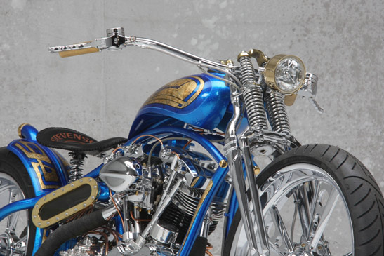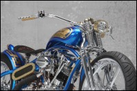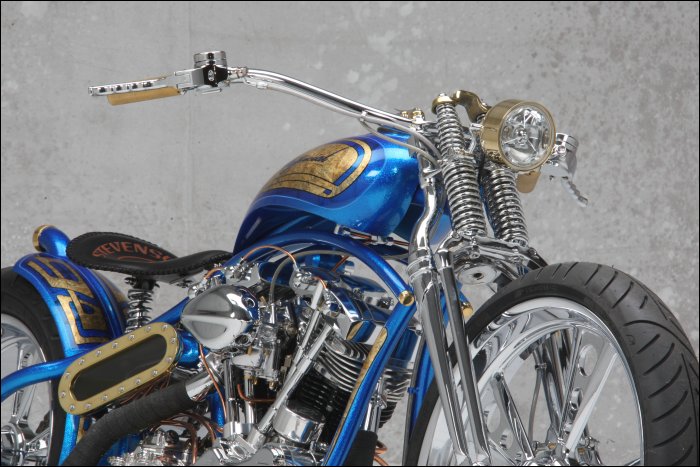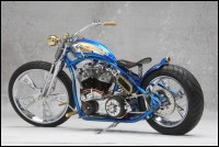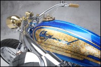 Всё, что касается работы с металлом, было сделано в стенах мастерской, лишь крышка бака была куплена у Crime Scene Choppers. Маслобак, так здорово подходящий мотоциклу по дизайну был сделан с двумя иллюминаторами из толстого стекла по бокам, что стало довольно неожиданной деталью. Всё было завершено простым задним крылом с вмонтированным в него стоп-сигналом. После завершения газосварочных работ настало время лакокрасочных и тут мастера превзошли себя. Синий металлик, отделанный золотой фольгой – просто прекрасен! Последними деталями в мотоцикле стало изготовленное Дуаном Баллардом седло и рычаги Jocker Machine.