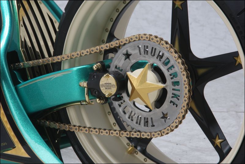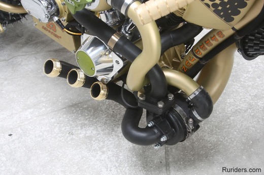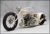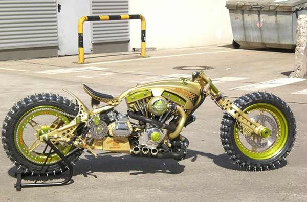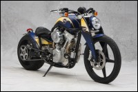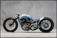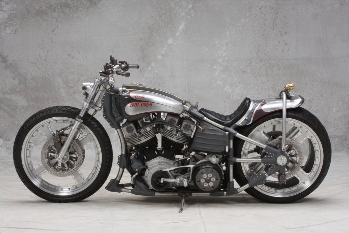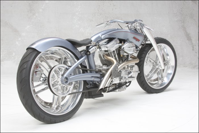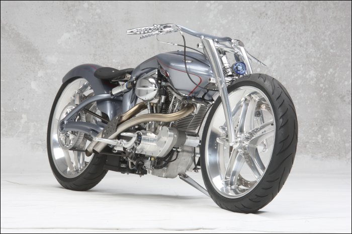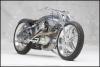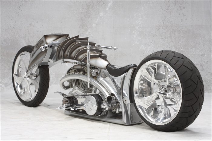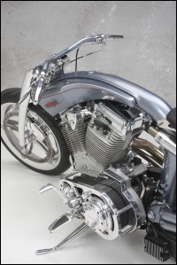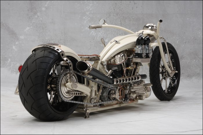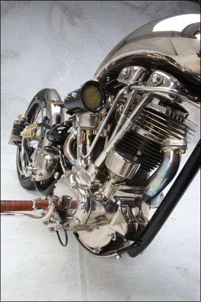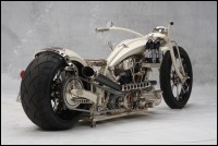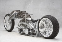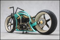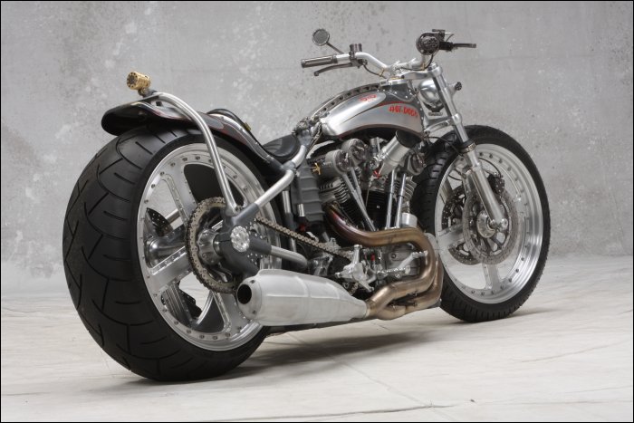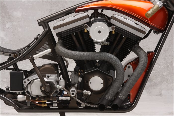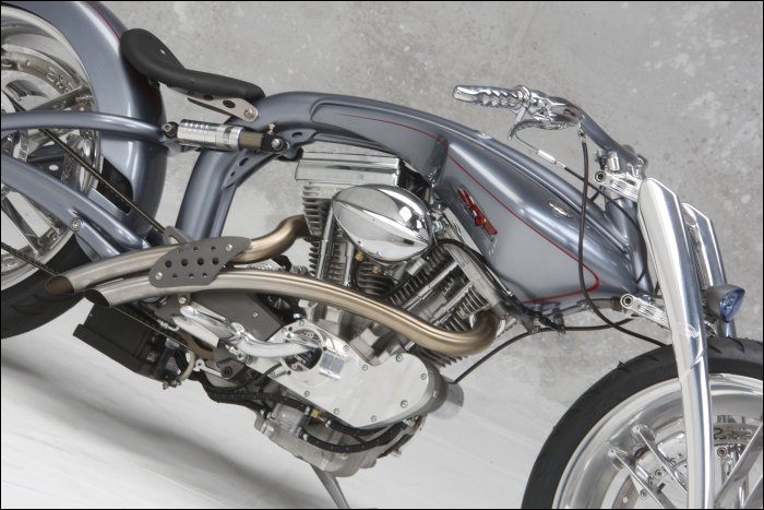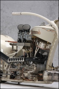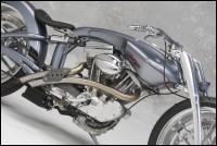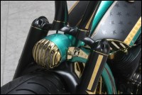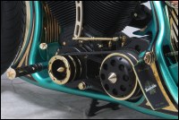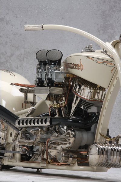 Но что же так поразило судей и коллег Голдаммера в мотоцикле, получившем звонкое имя Goldmember? А то, что и всегда поражает в работах Роджера, - потрясающая технологичность и инновационность. Здесь снова не обошлось без излюбленного трюка кастомаизера - отрезания переднего цилиндра тюнингованного харлеевского двигателя и пересадки на его место заднего. Освободившееся место также традиционно занял чарджер, а вот что касается системы впрыска - тут появилось кое-что новое, а точнее, возможность одним нажатием кнопки оставить всех соперников позади, впрыснув в камеру сгорания немного окисленного азота. Кроме того, для достижения наилучших спортивных результатов Роджер изобрёл и изготовил собственный распредвал и минимизировал возможность ошибки пилота с помощью установки электрического переключателя скоростей.