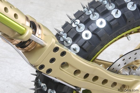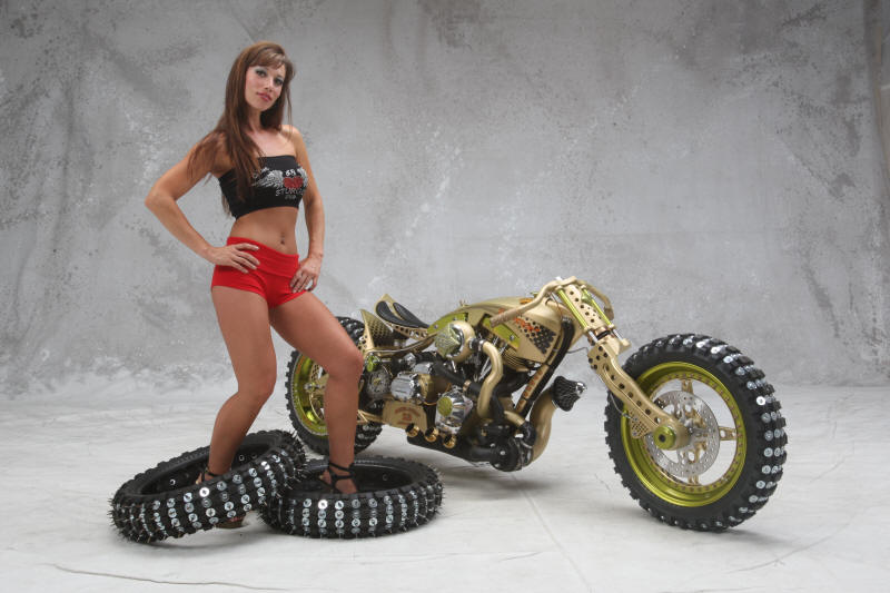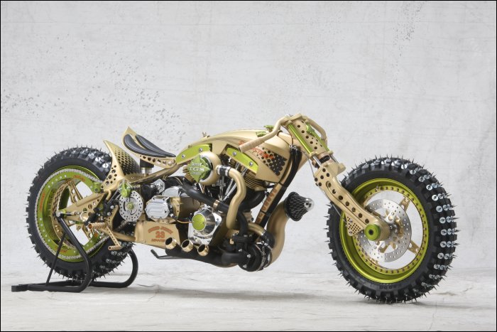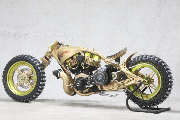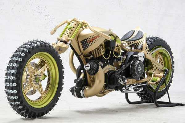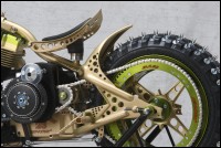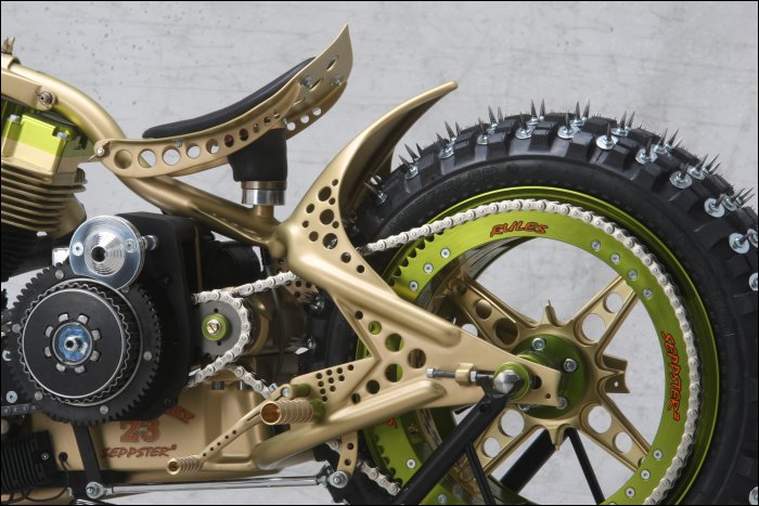 На этом байке всё настоящее, и если наступит очередной ледниковый период, то ездоку, оседлавшему Seppster2. не зачем беспокоиться о сцеплении шин с ледяной дорогой.120 острейших шипов на каждом колесе делают этот мотоцикл чрезвычайно опасным. А если задуматься с какой скоростью и с каким сцеплением с ледяной поверхностью этот байк может промчаться, преодолевая поворот за поворотом ледового трека, как это происходит на гонках Ice-speedway, то вообще становится страшно! «Сэпп знаком с одним гонщиком, который принимает участия в гонках Ice-speedway, и это подтолкнуло нас установить на наш Seppster2 шипованные колеса, именно этому парню мы обязаны этой неожиданной идеей, - объяснил Тобиас Гукель. - Такого в кастом-индустрии ещё никто не делал!»
