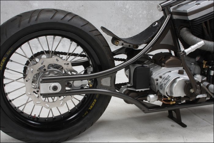 Шасси мотоцикла - это переделанная однотрубная жёсткая рама из серии Carrera от TGS Motorcycles, каторая была использована в 2007 г. на прототипе Seppster. Спроектированная Тобиасом Гукелем, она в характерном и компактном дизайне Race, с её расположенной коробкой передач на высоте, там, где обычно находится стартер, имеет очень хорошие качества для езды в поворотах с ужасающим углом наклона. Для привода заднего колеса были установлены две огромные звёздочки слева и справа. Промежуточный вал расположился за трансмиссией и связан с КПП малым цепным приводом. Вал вращается через две приводные цепи, и на нём закрепился задний тормозном диск. Идея не новая, но очень даже рабочая. Заднее колесо было выбрано из ассортимента TGS.