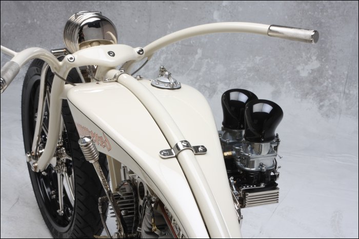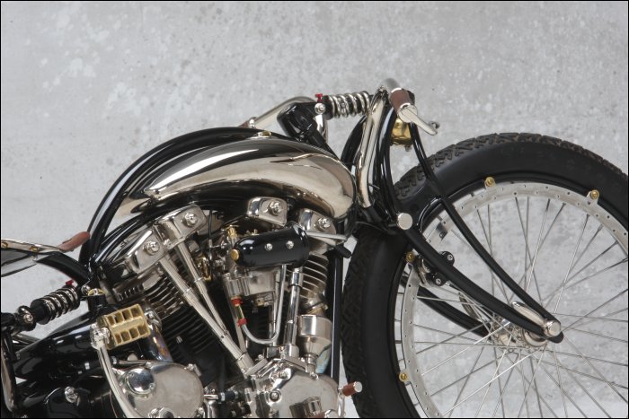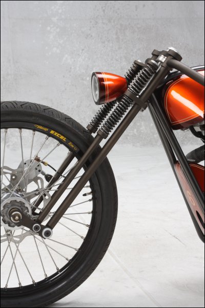 Избрав стиль старой школы, Бройлс и не предполагал ничего другого как использовать вилку-спрингер. Он полностью её отхромировал и добавил элементы из бронзы, которыми украшены все узлы мотоцикла.