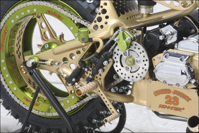 На Seppster2 видно всё «На нём незачем что-либо прятать -улыбается Сэпп. - Так как для этого байка не существует никаких классов или гонок, в которых ему можно было участвовать, устанавливать защиту первичного привода незачем! Настоящие мотоциклы для езды по ледовому треку выглядят как клетка из металлических прутьев, а у Seppster2 этого не существует!»