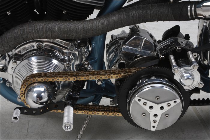 Первичная передача была спроектирована Стивом и создана Evil Engineering. Новая конструкция заставила убрать стартер за 6-ти ступенчатую коробку передач Baker Torque Box.