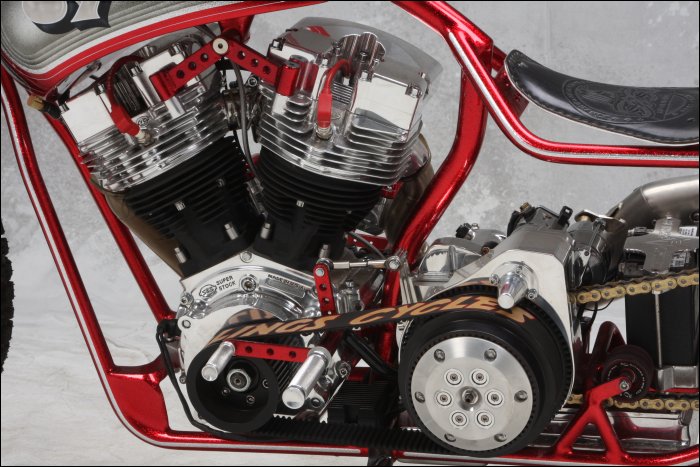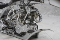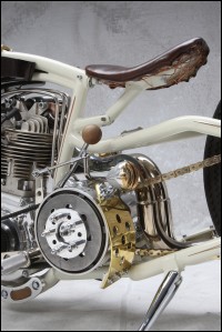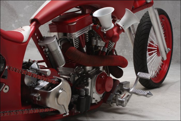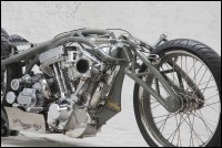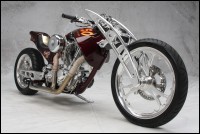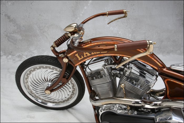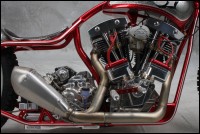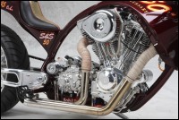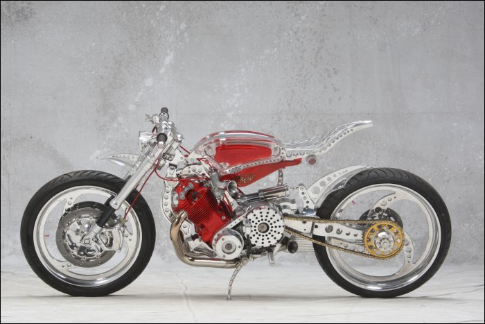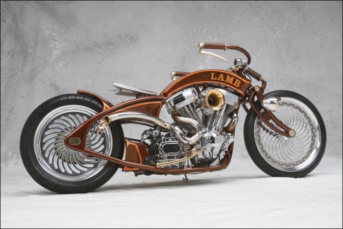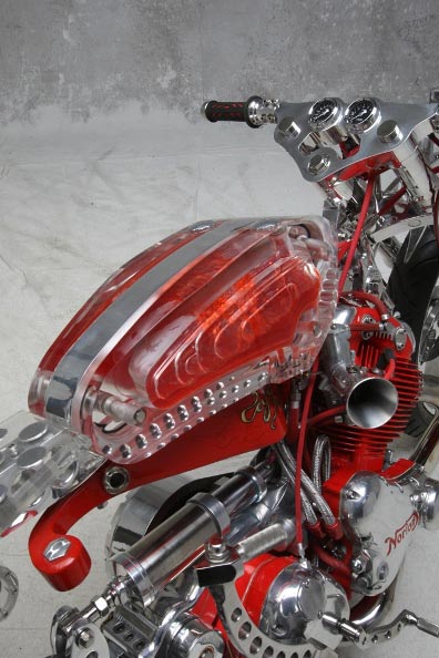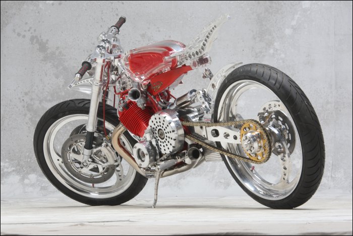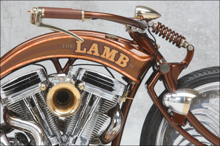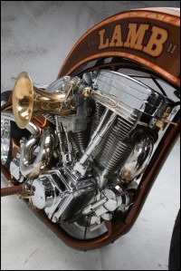 Успокоившись на этом с механической частью, Ларри принялся за визуальную составляющую, а именно она и привлекла внимание общественности к мотоциклу. Дело в том, что бак, крылья и седло Ларри выполнил из прозрачного акрилового полимера, обработав его на двуосном станке и вручную доведя поверхности до совершенства. Алая сердцевина бака вместе с таким же мотором напоминают здесь кровеносную систему неведомого организма, а полированный алюминий рамы и кронштейнов вконец делают мотоцикл похожим на биомеханического мутанта из какого-нибудь новомодного блокбастера. Эффектность – вот что было необходимо Ларри, чтобы оказаться замеченным на таком престижном соревновании и он мастерски этого добился. В ряду с более именитыми и опытными «билдерами» он смотрелся уверенно и свежо, не давая даже шанса усомниться в его серьёзных кастомайзерских амбициях. И если второй выставленный мотоцикл Lamb не удостоился большого внимания, то прозрачный каферейсер уж точно запомнился всем.