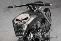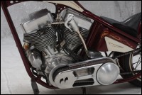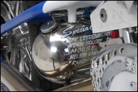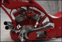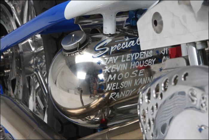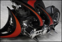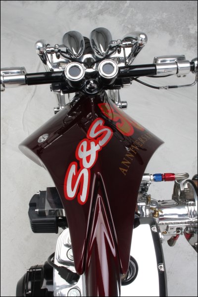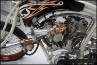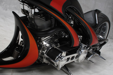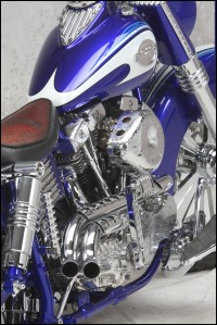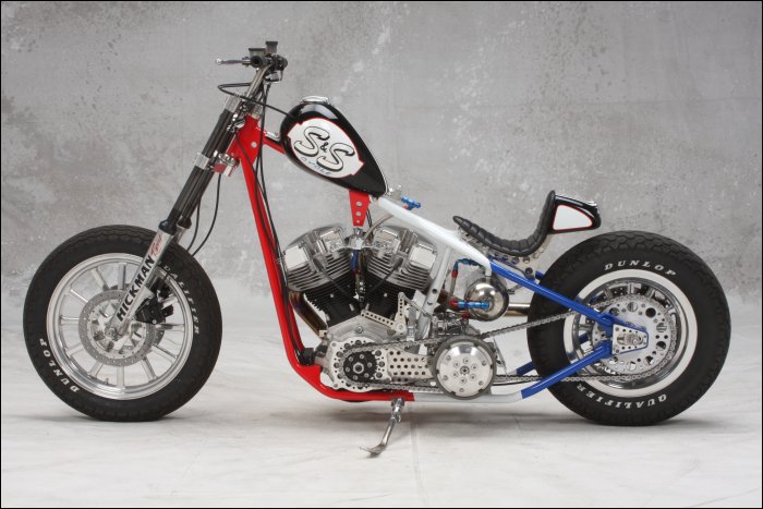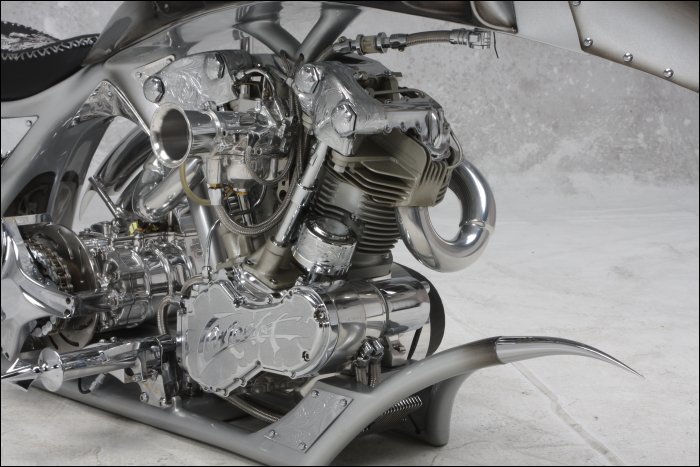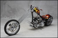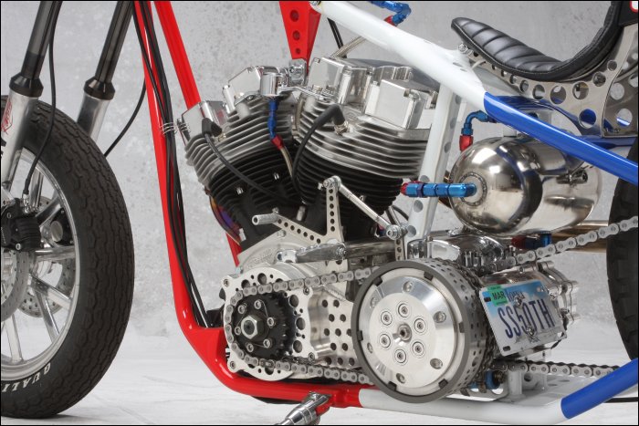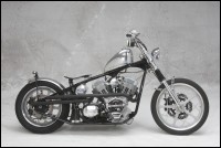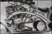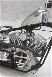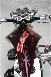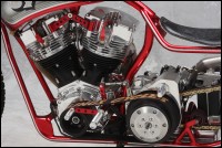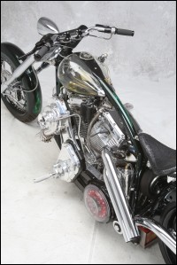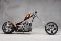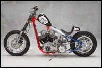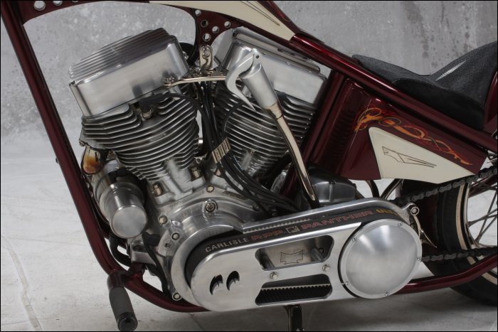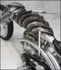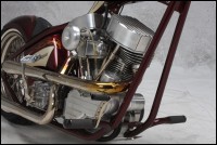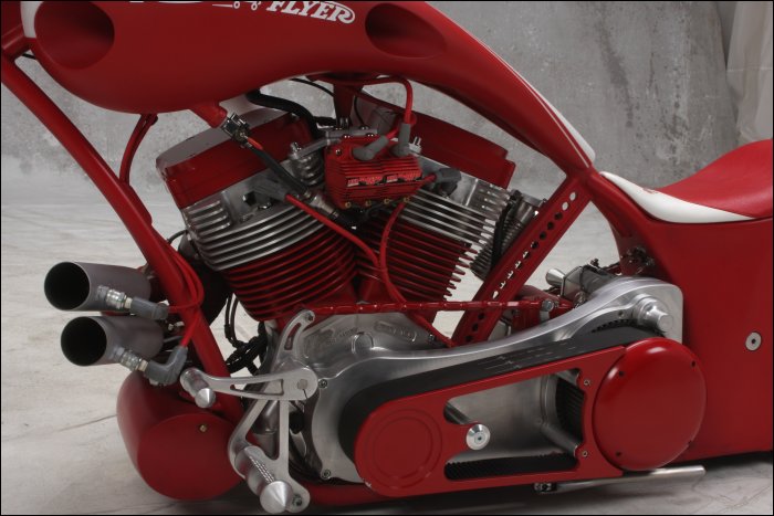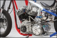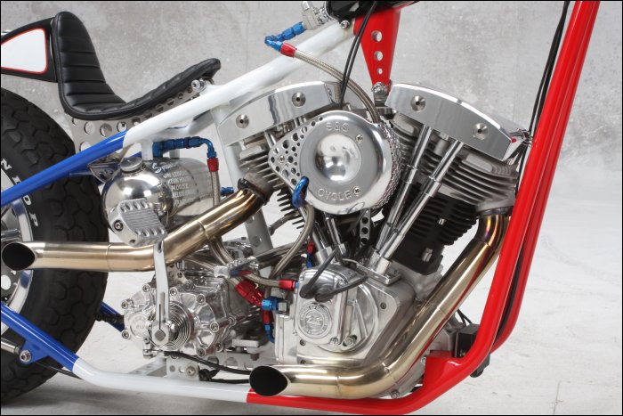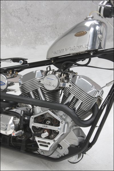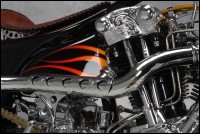 The following parts are all one off made by John Shope at Ssinister Choppers: pipes, tank, handlebars, shift linkage, seat, motormount, flame throwers, air cleaner, frame, oil bag, rear fender. |