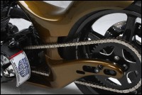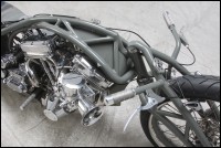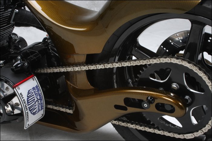 В отличие от ни чем не примечательной японской перевёрнутой вилки, интересной и необычной получилась задняя подвеска мотоцикла. С помощью всё того же ЧПУ был изготовлен алюминиевый маятник, который с помощью рычага соединён с мощным моноамортизатором, вполне способным «обслужить» не очень крупного ездока.
