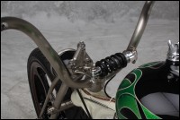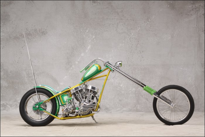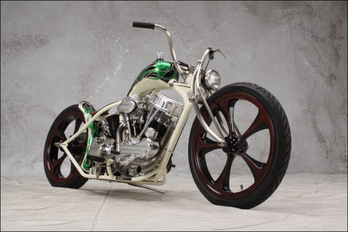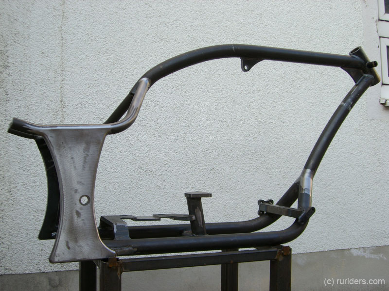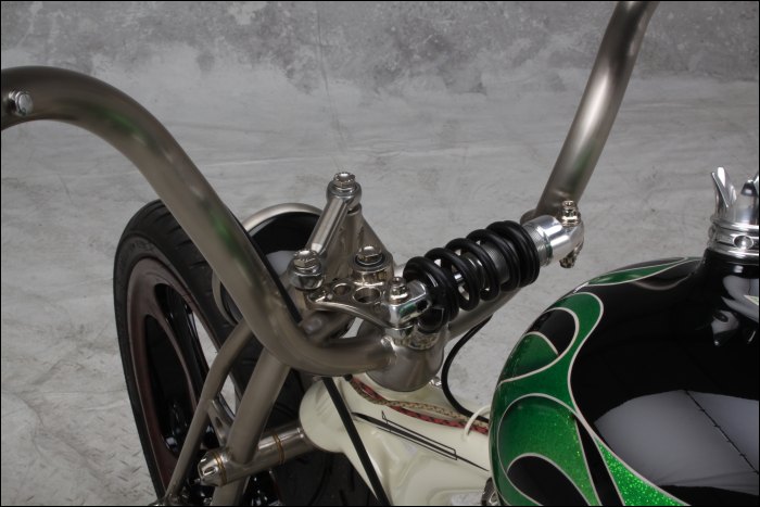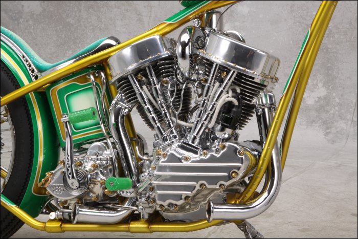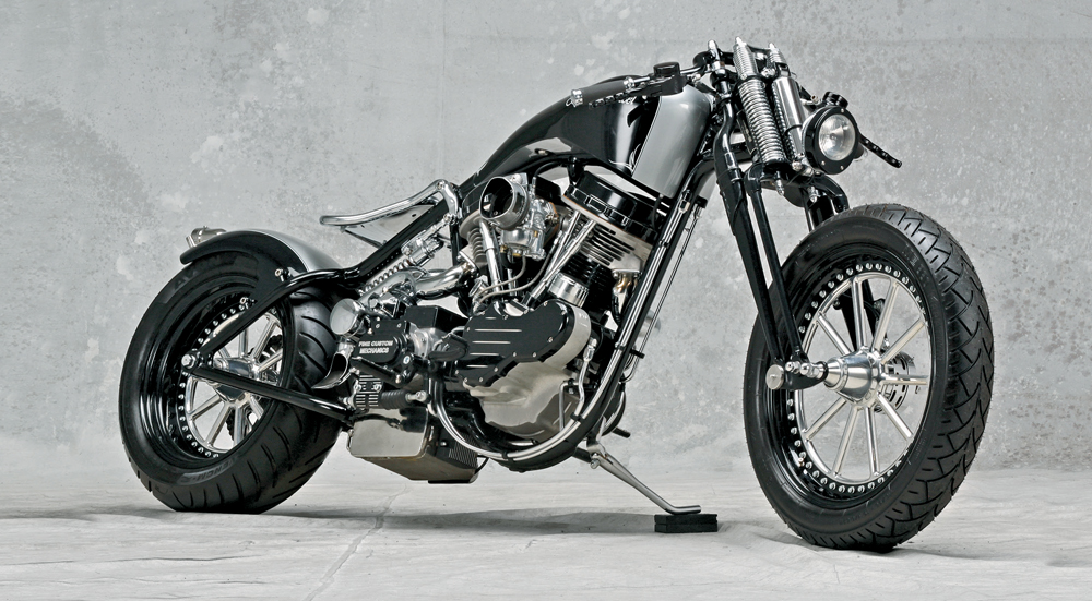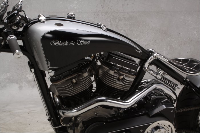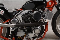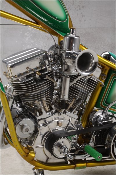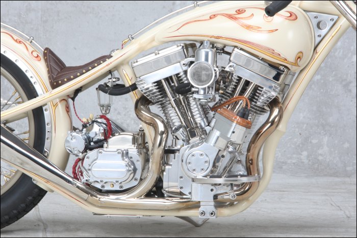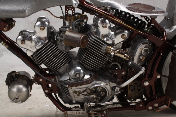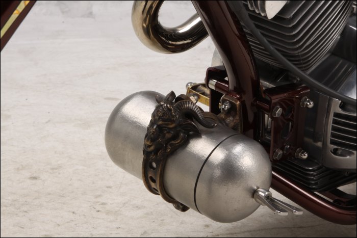 Над мотором удалось приторочить популярный одно время у американских кастомайзеров «кобровидный» бак от Twisted Choppers.