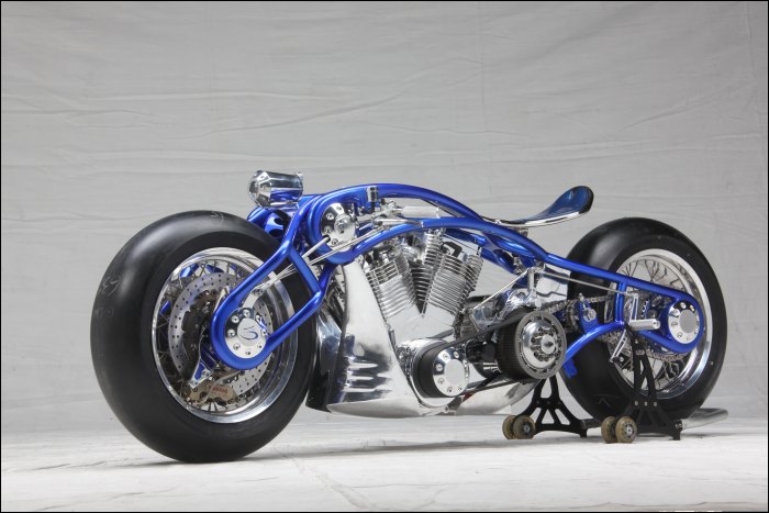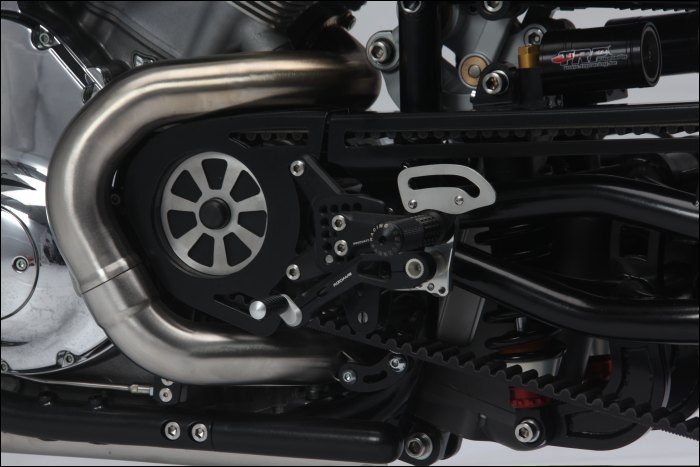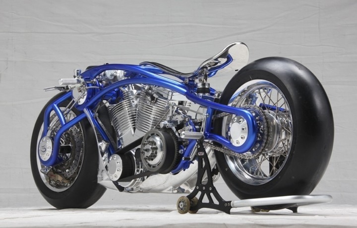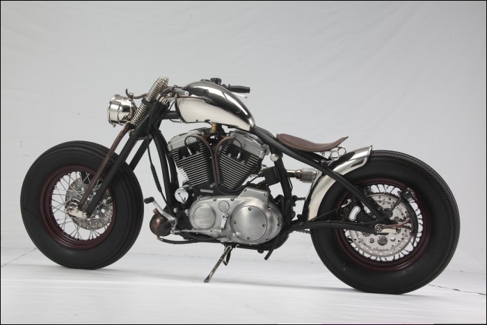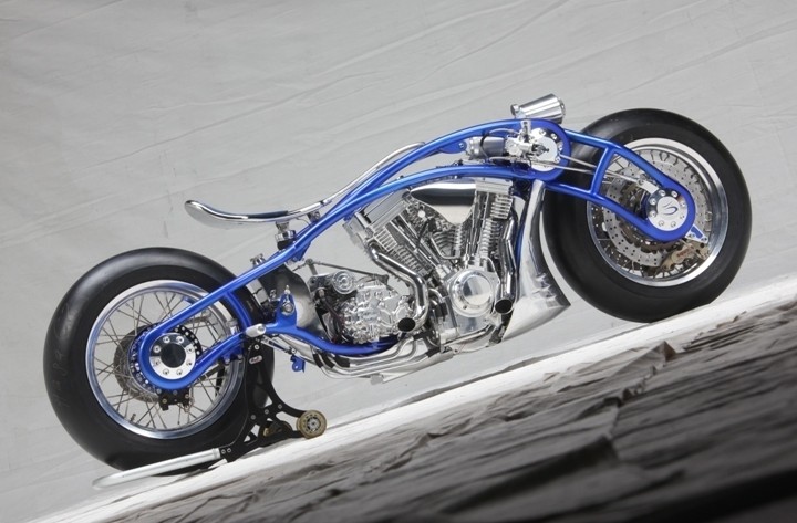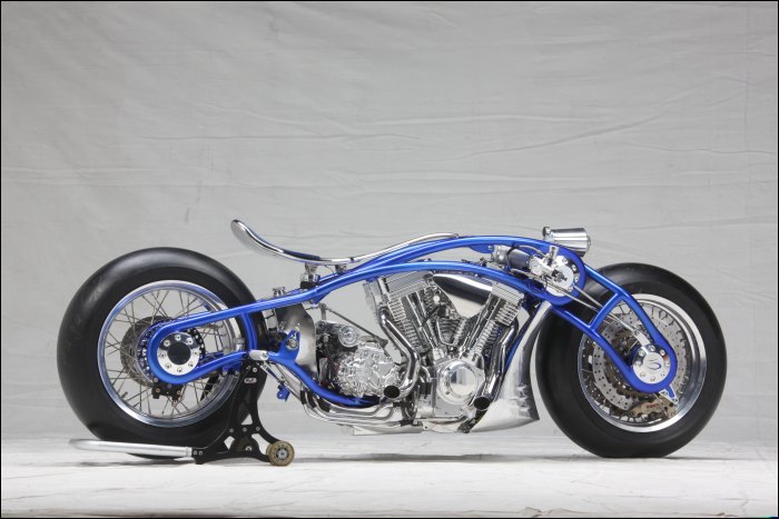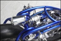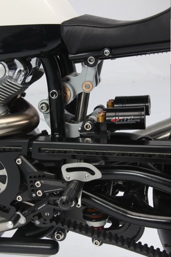 Шасси сухая рама Speed Shop Design с выведенными в нижнюю часть глушителями, параллелограмная вилка, колёса 20”, шины Firestone. Механический тормоз оригинальной конструкции.