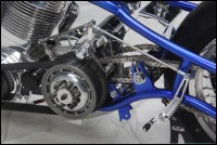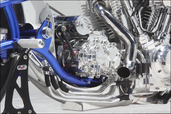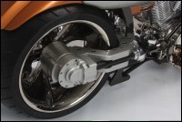К августу 2006-го был готов чертёж рамы 1:1 и выточены основные крепёжные элементы. К марту следующего года рама была полностью готова и началась работа над бензо- и маслобаками. Но основные головоломки были ещё впереди. Чтобы передать переднему колесу лошадиные силы мощного 101-дюймового двигателя Patrick Racing, Эдди модифицировал 5-ступенчатую коробку передач Baker так, что всё усилие передаётся на карданный вал, идущий через весь мотоцикл к специальной трансмиссионной системе, которая, в свою очередь, цепной передачей в масляной ванне, отправляет посылку адресату – широченному 360мм переднему колесу, крепящемуся на консольном маятнике. Проведя немало времени в раздумьях о тормозной системе, Эдди решил остановиться на системе 360 brakes, разработав лишь систему крепления – с противоположной стороны от консоли.