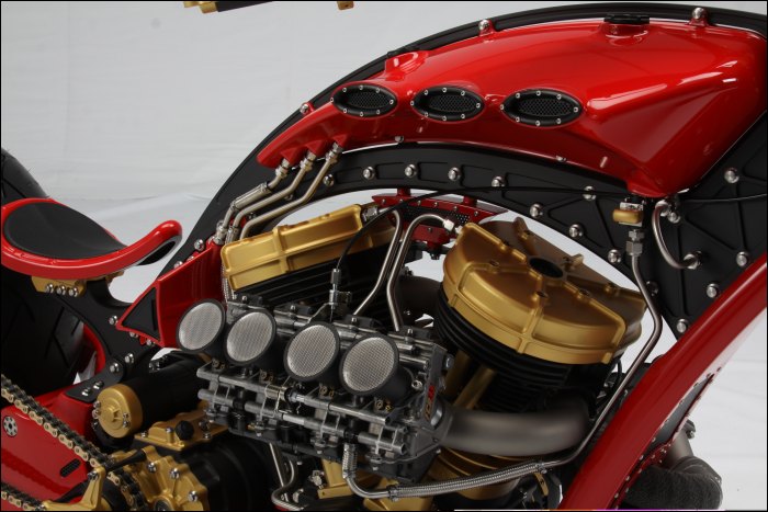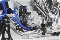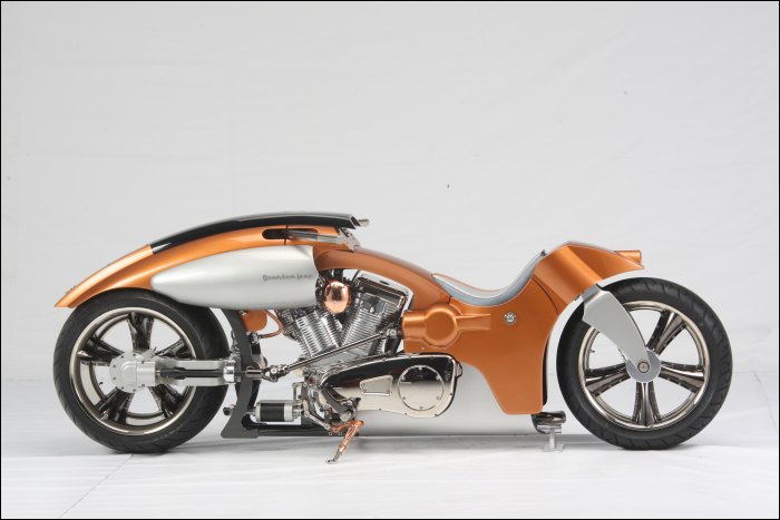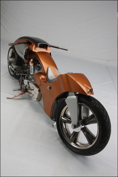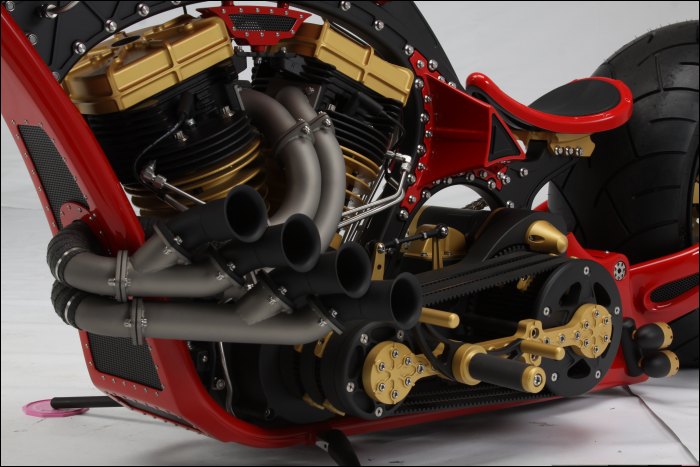 Ещё год назад в мастерской в маленькой бельгийской деревушке кипела работа. На столе стоял мотор от V-Rod, нечто неожиданное для Фреда. Кипела работа над уникальной рамой, которая должна была сделать его чемпионом. А всё началось, когда Фред ударил по рукам с Пеером Тофнером и Марком Ван Дер Квааком. Первый, норвежский инженер, на протяжении четырёх лет разрабатывал и патентовал систему, которая бы от кнопки меняла рэйк и колёснуя базу мотоцикла., второй, монстр автокада, сделал 3-D проект, а Фреду предстояла самая малость - сказку сделать былью. Насколько для г-на Бертрана это оказалось тяжёлой задачей история умалчивает, но факт есть факт - он справился и мир увидел нечто настолько необычное насколько и ожидаемое - мотоцикл трансформер, мечту голливудских режиссёров и головную боль японских проектировщиков. Нежное нажатие кнопки приводит систему в движение и мотоцикл из круизёра с вальяжной посадкой и длинной базой превращается в поджарого «негодяя», готового на любые безобразия, включая и езду по плохой дороге.