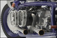 «Это будет мотоцикл на 95 процентов состоящий из компонентов, сделанных в мастерской», - говорил Крис в своём блоге перед началом работы. Пожалуй так оно и вышло, ведь кроме идеально отреставрированного 650-кубового английского мотора, снабжённого купленным в интернете и доработанным карбюратором SU, и амортизатора в параллелограмной вилке всё остальное – авторская работа с авторским же подходом. Кстати о вилке: сделанная из алюминиевых и стальных компонентов, она, по сути имеет абсолютно стандартную конфигурацию типа girder. При этом весь механизм двигается вокруг массивных неподвижных перьев и фары, затянутой в гриль-решётку и это решение уже выглядит как нечто совершенно уникальное.
