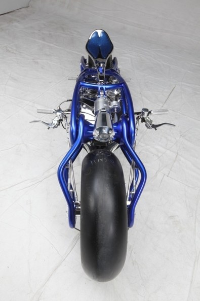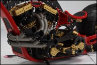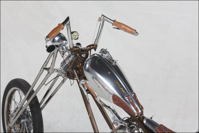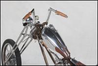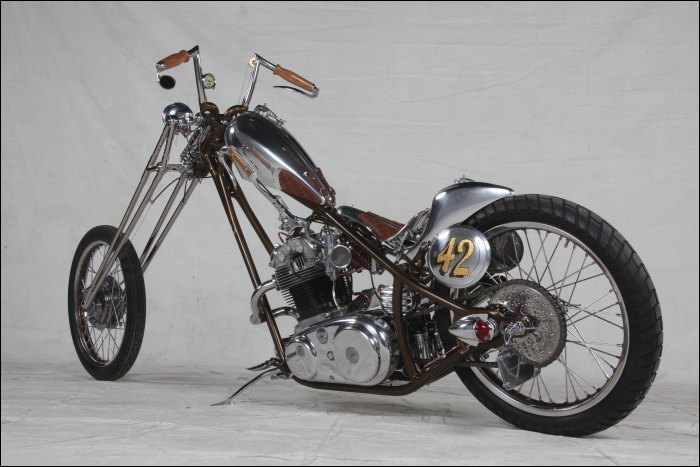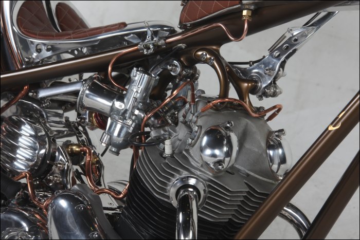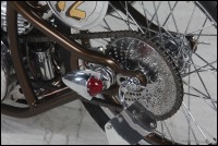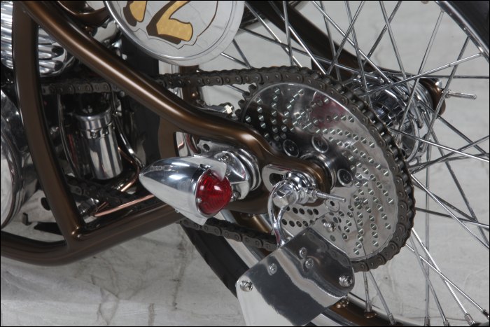 Рама помимо своей непосредственной функции скрыла в передней трубе основной резервуар маслобака, а в нижней части «приютила» выхлопные трубы, выходящие затем уже только под задним фонарём. Колёса двадцатого диаметра изготовлены по всем канонам стиля и даже обуты в винтажную резину Firestone. Такое внимание к деталям не может не подкупать и, понимая это, Крис не упустил ни одного шанса показать себя. К примеру, он снабдил заднее колесо весьма забавной механической тормозной системой с клином раздвигающим рычаги и сводящим колодки на диске, одновременно являющимся и задней звездой. Но не тормозам и колёсам обязан мотоцикл за своё пятое место в таблице чемпионата, дизайн бака, нельзя сказать, что плавно, но всё же переходящего в хвостовую часть, задал весь силуэт, настроение, а значит, в данном случае, и судьбу всего мотоцикла. Такая масштабная и необычная работа просто не укладывалась в общепринятые, выстраданные поколениями мотоэнтузиастов нормы, а значит была обязана вызвать у зрителя эмоции. Положительные или отрицательные? По результатам вроде понятно!