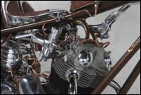 Сверху бензобака, очень оживив конструкцию, расположились горловины и для бензина и для масла. Каферейсерский руль продолжил тему минимализма и претензий на исключительный стиль, а ручки от велосипеда Schwinn с системами поворотного не только газа, но и сцепления избавили мир от лишнего рычага. Говоря о стёганом кожаном седле, сделанном для Криса его другом Стоу из Такомы (штат Вашингтон) и являющимся безусловным примером удачного дизайна, Крис употребляет слово «убийственное» и кроме красоты на ум сразу приходит другое возможное значение этого термина – ездить на сухой раме с такой несерьёзной подушкой может быть не сладко, даже не смотря на толстые шины. А ездить придётся, не прятать же такого красавца в гараже, тем более, что все регистрационные бумаги в порядке, световые приборы работают, а геометрия мотоцикла осталась практически той же, что и у старинного английского прародителя.