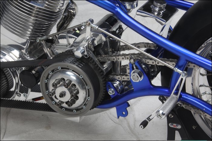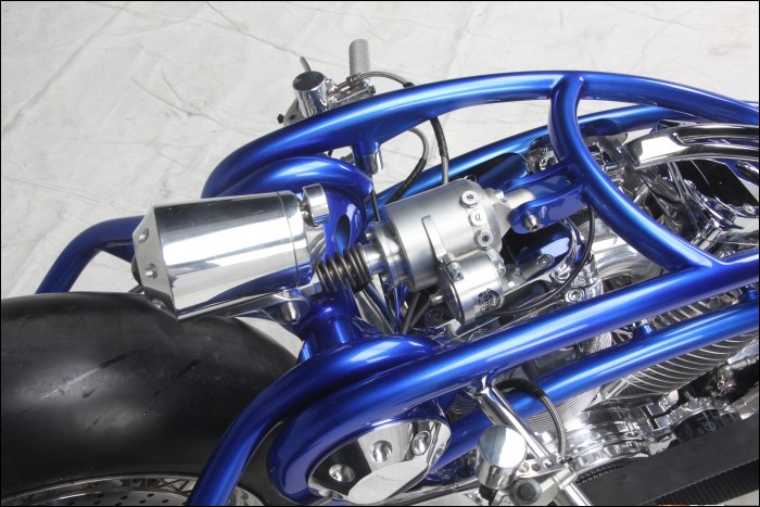 Bike is Front Wheel Drive and rear steer, both front and rear are suspended by air shocks from Custom Cycle Controls and the rear steers and moves with suspension together. Bike is shaft driven and steering is by custom made hydraulic pumps and works by movement of hydraulic fluids. Wheelbase 75".