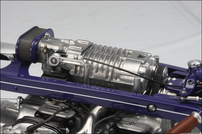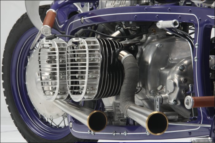 Pipes, carburation, rear-fender (=oil tank, aluminium), gas tank (alu), electrical and details like petcock, sidestand, battery tender (alu), handlebars, shifter (alu), seat (alu), housings of the lights, linkages for shifter and brakes (front and rear), fork (stainless steel) and frame are handmade, also.