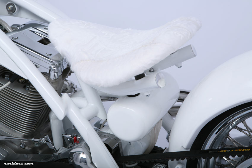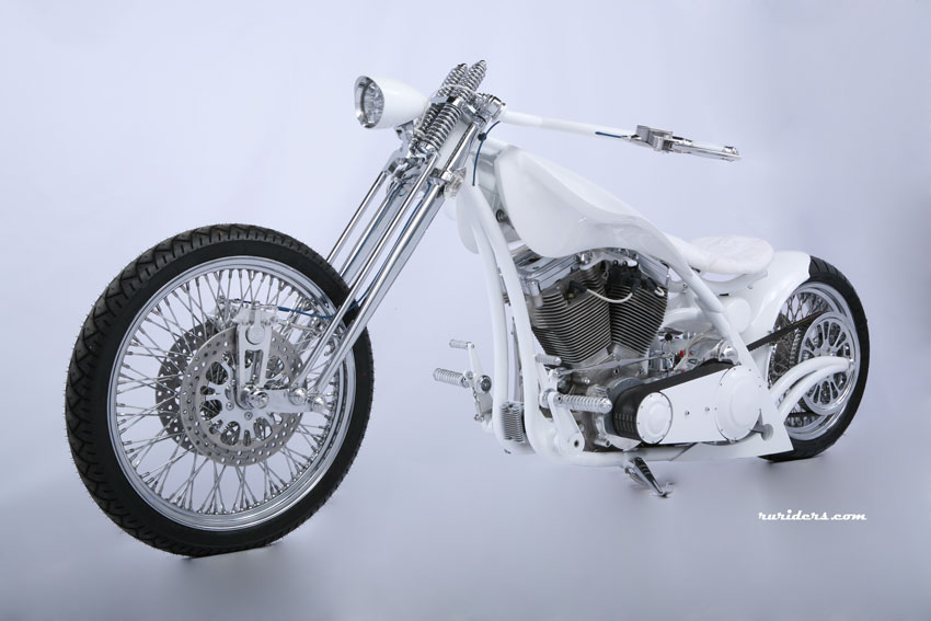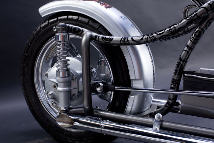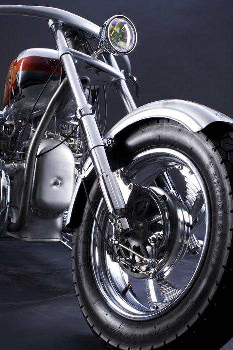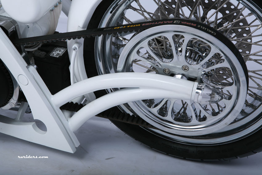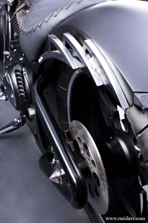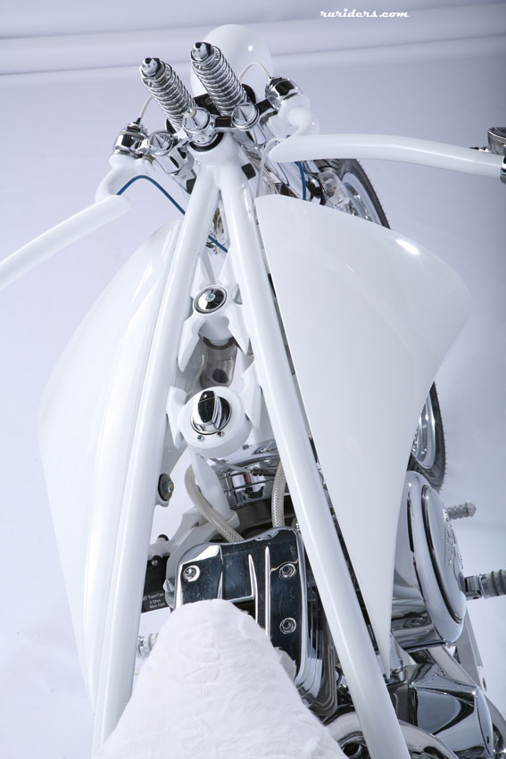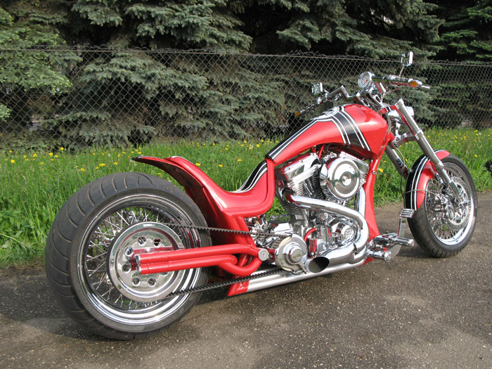 Всю прошлую зиму в мастерской кипела работа. Когда на свет появилась рама, всем стало ясно, что мотоцикл будет неординарным, настолько причудливыми были её линии. Двигатель под стать раме – Ultima 120ci с ремнём первичной передачи шириной в 3.35 дюйма. По правде говоря это был своеобразный риск, раньше никто не устанавливал этот мотор в России и о его характеристиках и надёжности можно было судить только по отзывам иностранных специалистов, однако за границей другие условия, своя специфика… Но всё сложилось удачно и вместе с 6-ти ступенчатой коробкой Trickshift мотор показал себя с самой хорошей стороны, удивив даже любителей продукции компании Zippers.