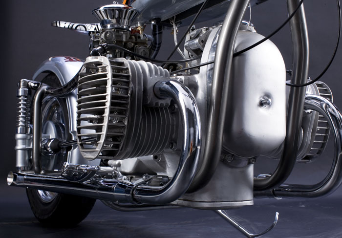 Другими техническими решениями достигаем обязательного современного уровня. Устанавливаем мощный автомобильный 12-вольтовый генератор и новое зажигание, электростартерный запуск двигателя, рычаг кикстартера убираем совсем.