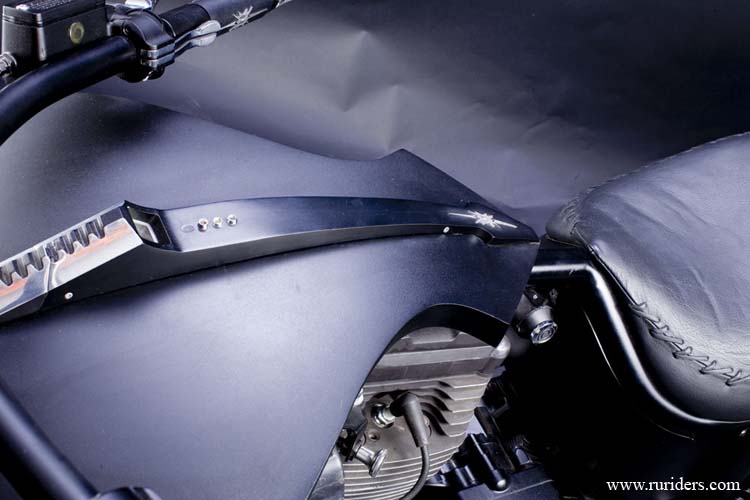 Всё вышеперечисленное берем в основу и добавляем несколько современных модных решений. Делаем бензобак раздельным с видимым разделяющим хребтом рамы; ставим в меру широкие колеса, причем переднее ниже заднего; руль низкий, короткий, выгнутый по дуге со спрятанными тросами управления; стильное тонкое седло со скрытой пружиной.