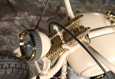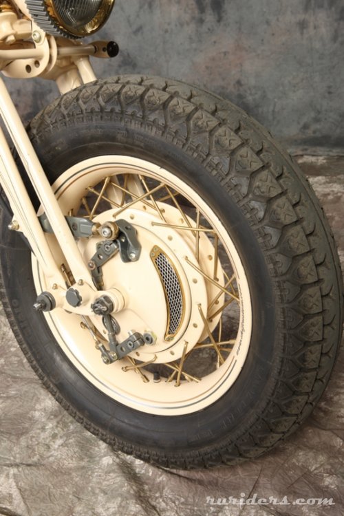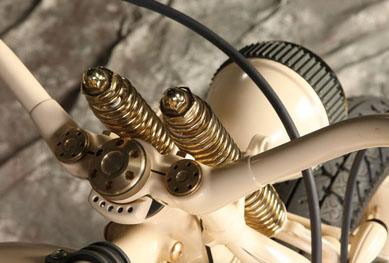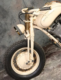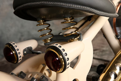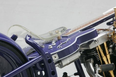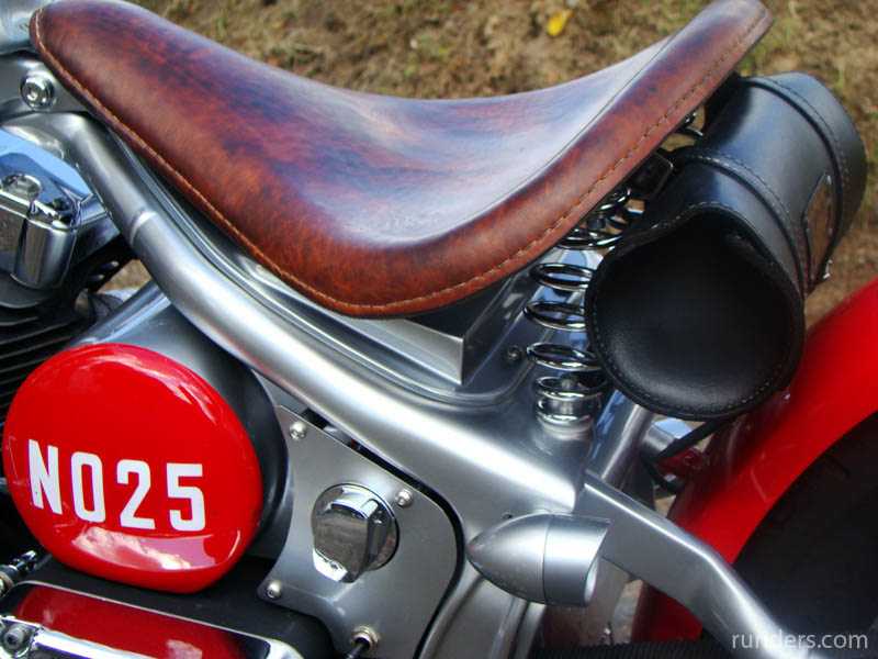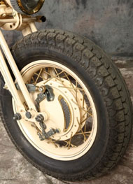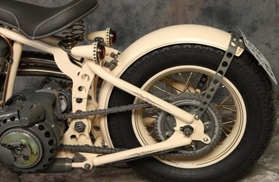 Чтобы сделать раму этого мотоцикла, Юрий досконально изучил строение аналогичных частей старинных Цундапов на примере образцов, под расписку взятых у друзей. Вариант трубчатой рамы отметался изначально – в 30-е годы рамы так не делались. Они штамповались из листового металла и именно этого эффекта Юрий добился в конечном итоге. Задняя подвеска вполне логично сухая, в то время как передняя абсолютно оригинальна. Вертикально расположенную рессору в дуэте с системой hub steering (вместо классических перьев – боковые тяги), да ещё и консольной, на моей памяти не использовал ещё никто, однако здесь она смотрелась вполне логично и функционально. Обтекатель в стиле опять же старых гоночных авто не только исключительно элегантен, но и, по заверениям Юрия, вполне способен справиться со своей конструктивной задачей. Вообще, в нашем случае Юрий остался верен своему принципу и мотоцикл с сидящим на нём человеком смотрится даже более выигрышно чем без него, а когда принимается правильная спортивная поза – сомнений в будущих рекордах не остаётся.