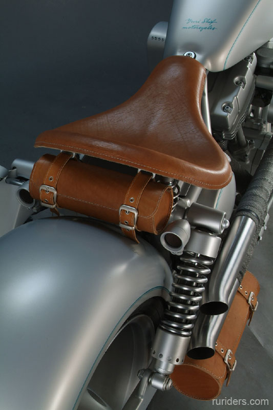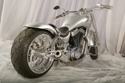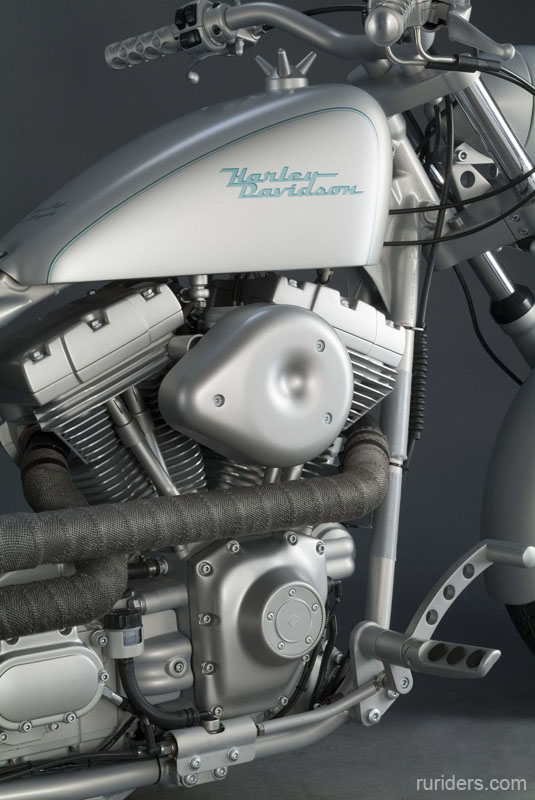 Прежде всего, стоит отметить, что в качестве донора был взят не самый удачный для этих нужд мотоцикл Dyna, отличающийся от собратьев не только далёкой от эстетического совершенства подвеской, но и некрасивым, по мнению многих, креплением аккумулятора, которое (ящик под седлом на правой стороне мотоцикла) свело на нет многие попытки менее опытных кастомайзеров окультурить вид одного из самых «ездовых» харлеев. Для некоторых людей подобные трудности лишь поднимают интерес к работе и Юрий Шиф явно из их числа. Немного потрудившись над узлами мотоцикла и поиграв с дизайном, он получил отличный результат – нечто среднее между классическим боббером и майнстримом, замечательно обыгранный серебристо-холодной цветовой гаммой.