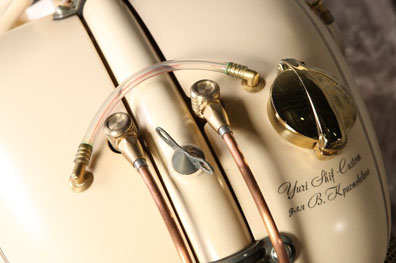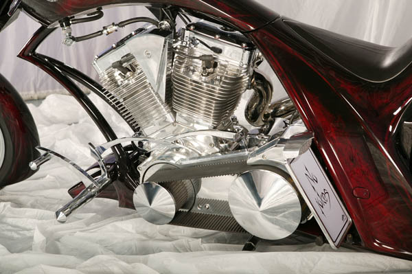 Абсолютно всем, начиная от формы и заканчивая мелкими аксессуарами, The Machine просится на старт гоночного заезда, а для создания такого впечатления пришлось провести грандиозный фронт инженерных работ. Сдвоенные двигатели – это то, о чём думали самые талантливые мастера эпохи «самопалов» и то, что впервые создал Юрий Шиф. Четырёхглавый оппозит построен на основе двух моторов К-750. Картеры от доноров присутствуют в новом корпусе лишь в виде фрагментов, всё остальное это огромный фронт высокоточных работ. Половинки коленвалов переднего и заднего двигателей соединены с помощью упругих резино-металлических демпферных муфт. Одним из сложнейших элементов мотора стал специальный распредвал, спроектированный с учётом того, что задние цилиндры повёрнуты в обратную сторону. Это было необходимо для того, чтобы сделать центральный впускной коллектор и сохранить компактность общей конструкции. Сверху двигателя Юрий установил лопостной нагнетатель системы братьев Рутс. Для того чтобы вывести на него привод пришлось установить в переднюю часть мотора генератор маховичного типа.