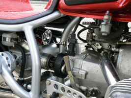 От рамы осталось только крепление двигателя и рулевая колонка, вся остальная конструкция была изготовлена заново в виде классического высокого треугольника, так, чтобы ездок видел впереди только фару и дорогу. На этот раз мастера сжалились к хозяину и установили седло La Perra на высоких пружинах. В дебрях Интернета была найдена выхлопная система с модели 1979 года, под которую немного переделали остальную магистраль, но результат того явно стоил, редко когда встретишь настолько интересный силуэт выхлопной системы.