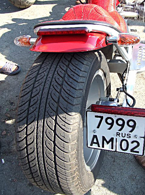 Его основой стала пространственная рама из труб квадратного сечения с передней вилкой оригинальной конструкции, в которой были использованы детали передних амортизаторов чехословацкого кроссового мотоцикла «CZ», спицованное колесо мотоцикла «Урал» и обшитый кожей руль мотоциклетного типа. Задняя подвеска – независимая на амортизаторах «Volkswagen Golf». Огромные задние колеса обуты в покрышки Goodrich 275/60R15 на переделанных дисках автомобиля Nissan. Под обтекателем расположены «сердце трайка» - 53-хсильный двигатель МеМЗ объемом 1,2 литра и коробка передач ЗАЗ-969. задние тормоза – дисковые ВАЗ 2109. для улучшения управляемости и устойчивости 20-тилитровый бензобак спрятан под сиденьем пассажира. А перед рулевой колонкой находится всего лишь фальшбак с расположенным на нем спидометром от Honda и Вазовскими датчиками температуры, горючего, контрольными лампочками и замком зажигания. «Крылышки» фальшбака прикрывают установленные под ним по обе стороны гидроцилиндры, связанные с идущими вниз подножками-педалями управления тормозами и сцеплением. Площадка для ног сварена из нержавеющих труб со щелями, как раз под педалями, работать которыми приходится держа ноги на весу, что сначала кажется непростым делом. Тем более если ручка газа мотоциклетная, а педали – автомобильные.