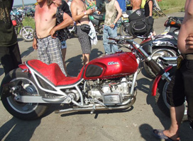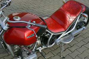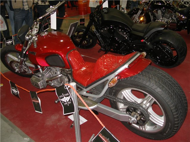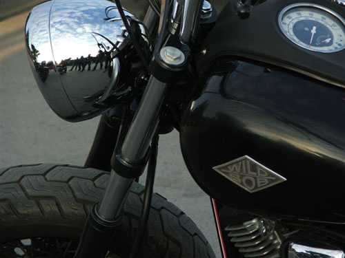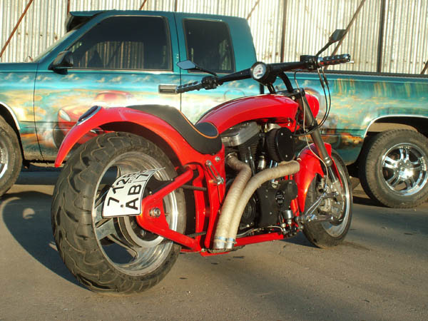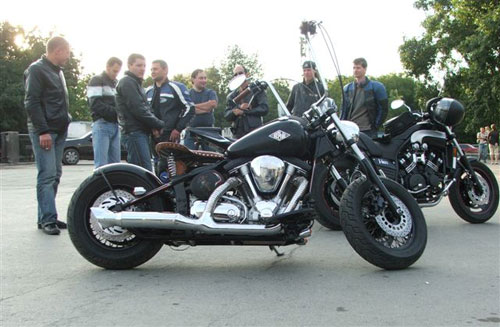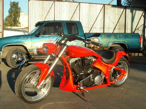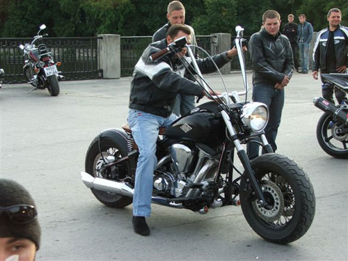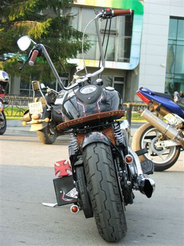 Стандартный мотор был, если так можно выразиться, форсирован с помощью комплекта жиклеров Dino Jet, фильтра низкого сопротивления K&N и прямоточного выхлопа R oadhouse . Когда приступили к работе, первым делом "расчехлили" толстую круизерную вилку, ликвидировали говноруль, а так же говнокрылья и потихоньку начал вырисовываться в наших головах будущий силуэт. Практически сразу было решено в отделке ходовой части использовать в разумных пропорциях цвета черный матовый и черный глянцевый нанесенный методом напыления (т.е. порошковая окраска). Как только под чехлами вилки обнажилась неопрятная кованная нижняя траверса, стало очевидно, что придется попотеть над изготовлением новых, которые получились вполне симпатичными с изящной фаской и на 10мм шире родных. Вперед попросилось колесо на 150, а назад на 180. Центральное место в нашем боббере отвелось сиденью на 5 дюймовых пружинах из одного куска металла, обтянутое одним куском кожи. Бак оставили стандартным, а вот бардачки в борьбе за неузнаваемость донора были изготовлены заново в стиле маслобака. Долго и кропотливо изготавливали заднее крыло: очень хотелось поставить его с минимальным зазором, наподобие сухой рамы, и, в результате, оно было прикреплено к маятнику, что сделало его эффектным и на стоящем мотоцикле и при движении. Естественно номерной знак перекочевал на выносную площадку со стоп-сигналом в виде мальтийского креста. Большая работа была проведена с колесными дисками, которые были разобраны, подготовлены и покрашены порошком, а спицы так хотелось сделать черными, что был найден завод, где их покрыли черным никелем (жаль не хромом), после чего все собралось с минимальными допусками по биению. Переднее крыло решено было не делать - всё в угоду стилю. На все работы по созданию нашего первенца ушло около 9 месяцев.»