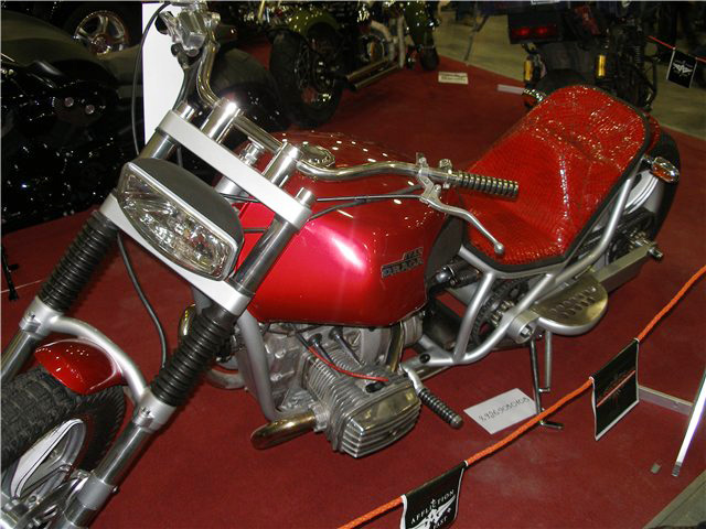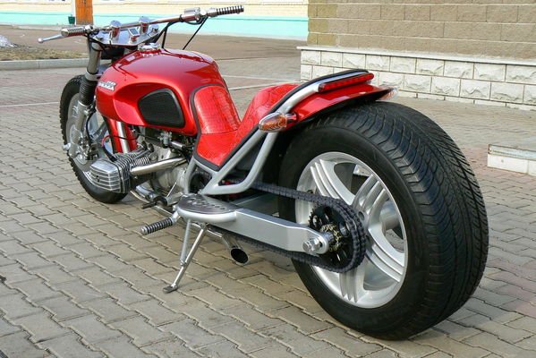 Электрооборудование штатное, от «Таврии», аккумулятор удалось удачно спрятать под сиденьем водителя. Система освещения состоит из указателей поворота, 2-х задних фонарей и 3-х фар, закрепленных на передней вилке. Венчают конструкции. Две эффектные вертикальные выхлопные трубы а-ля «американский грузовик» и черный пластиковый кофр.