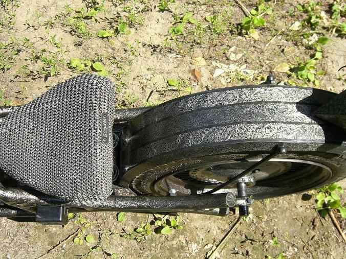 Фару, стоп-сигнал, заднее крыло и ящик для аккумулятора варил из листовой стали - получил требуемые угловатые формы. Переднюю вилку собрал из свечной рамы М-72 и толстостенных труб. Для жёсткости добавил третью траверсу. Бензобак - найденный на помойке дополнительный бачёк от какого-то грузовика. Пришлось его укоротить и врезать горловину. Заднее колесо - это докатка от японского грузовичка, рассверленная под спицы, на днепровской ступице. Седло - переделанное от М-72, обтянул его кольчугой. Руль со спрятанными механизмами газа и сцепления, а также ручки - сварил из тех же толстостенных труб, что и вилку. Карданный вал собрал из двух стандартных. Лапки переключения скорости и тормоза - велосипедные педали, - не совсем удобно, зато очень весело. Выпускная система - из нескольких ураловских патрубков, прямоточная, с тракторным звуком.