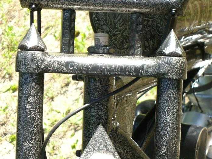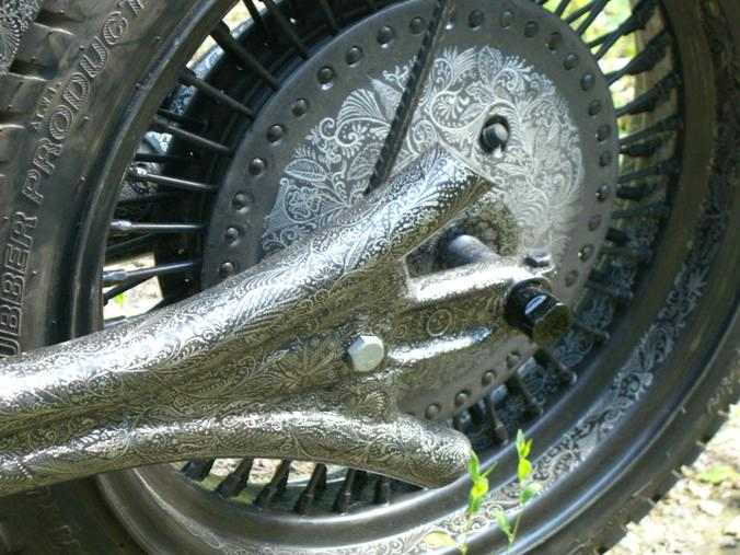 Когда увидел Айвенго - работа мастерской из Орехово-Зуево - понял, что гравировка - это хорошо! Очень хорошо!!! Отпали вопросы с окраской. Тогда я не предполагал, что буду гравировать весь мотоцикл целиком. Но втянулся. Тем более, долгие сибирские зимы… Сталь воронил средством для холодного воронения стволов - продаётся в оружейных магазинах. После чего бормашинкой наносил гравировку и всё это дело относил в полимерку - покрывать лаком. Двигатель полировал алмазными пастами и затем гравировал.