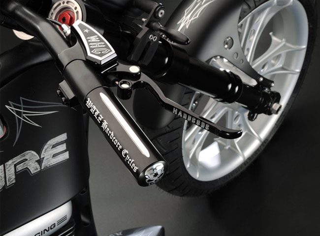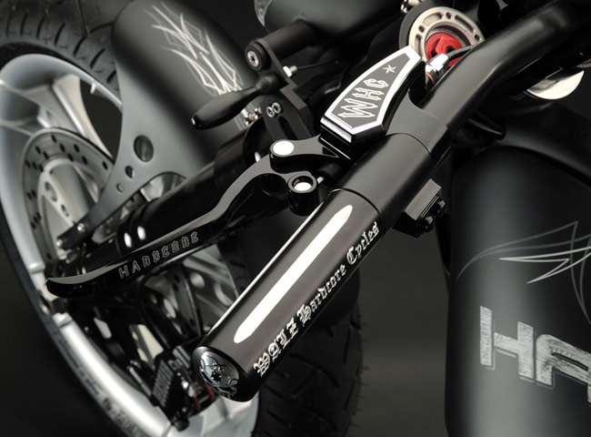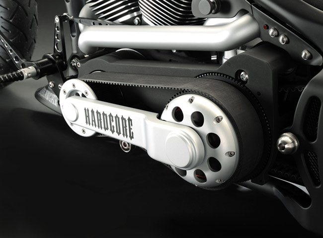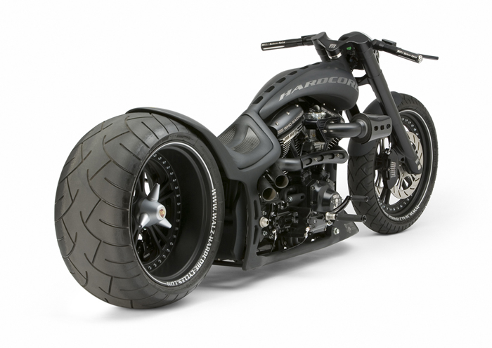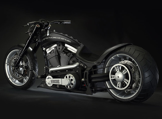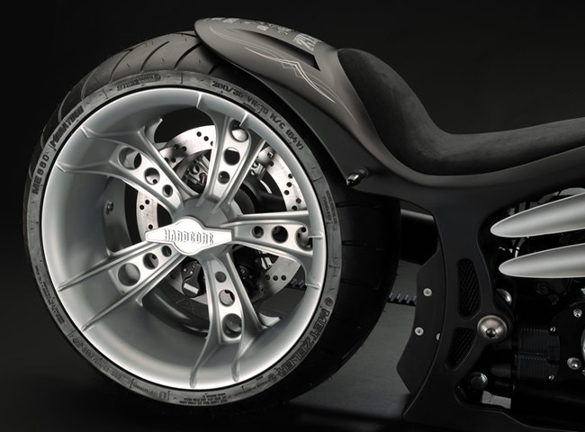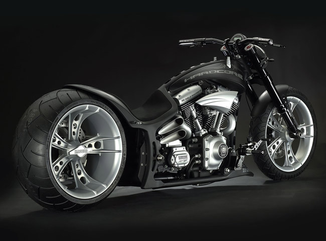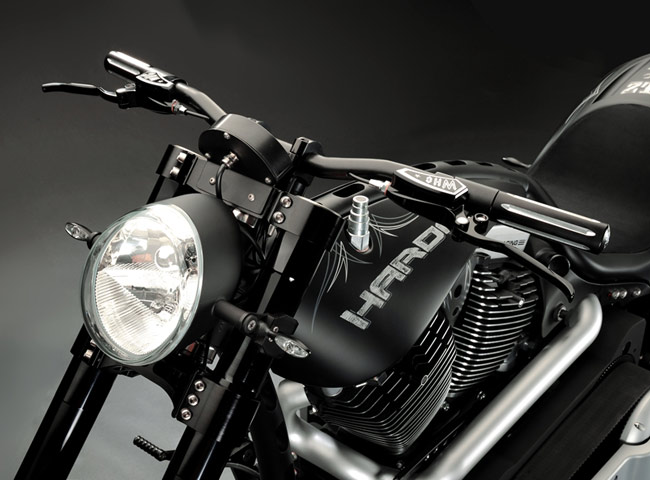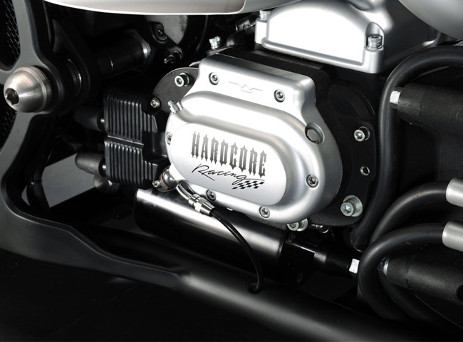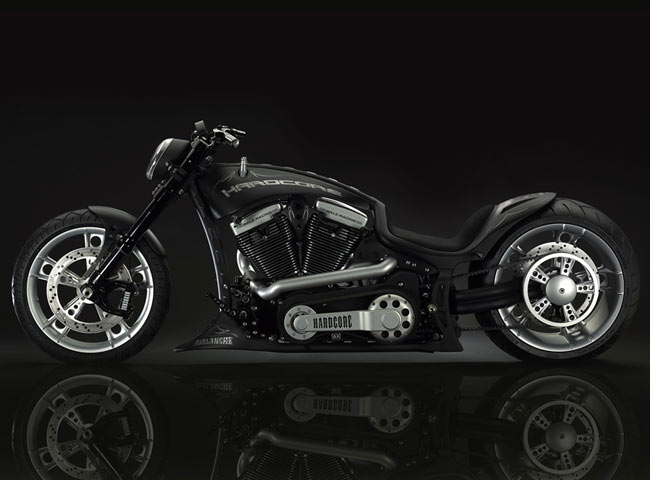 Все детали анодированы, черный цвет даже на перьях вилки. Карбон используется тоже обильно. Хотя, например, переднее крыло здесь не углеродное, как обычно, а полностью стальное. Тормозные суппорты радиального типа с 4-поршнями хоть и украшены логотипом компании, но на самом деле – они специально для Hardcore Cycles выпускаются фирмой Brembo. Головная оптика – единственная серийная деталь – она от «Харлея» V-Rod. Изюминка модели - так называемые, 3D-диски 18 дюймов алюминиевого сплава – дизайн просто шикарный! Они могу быть и черного цвета.