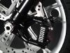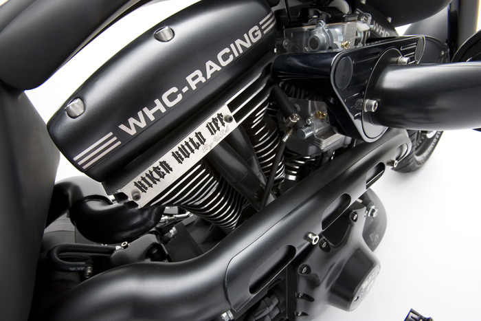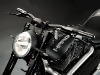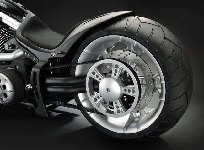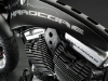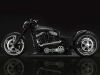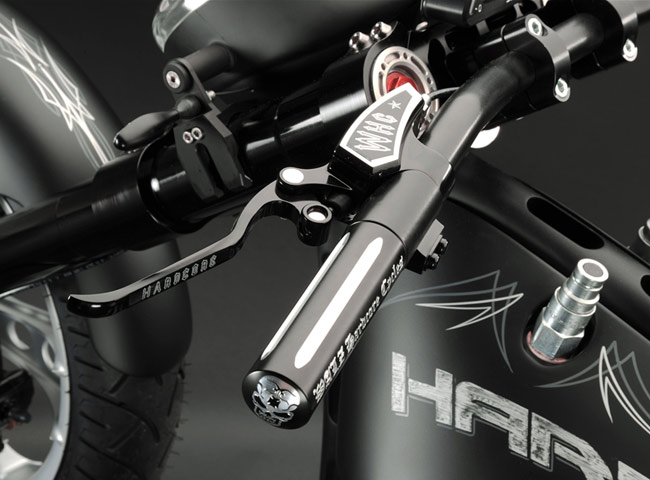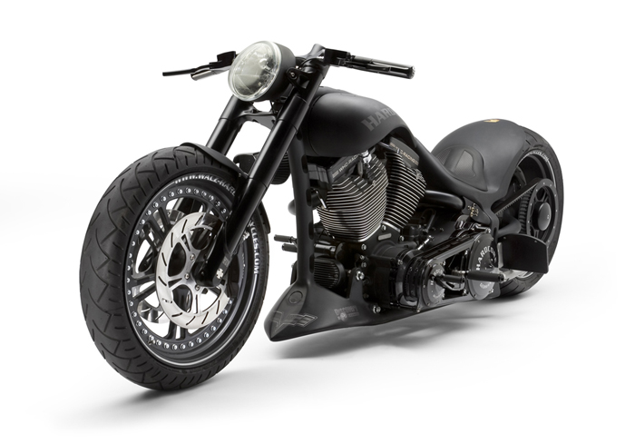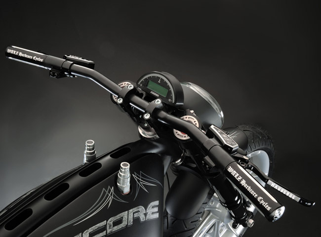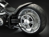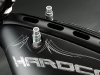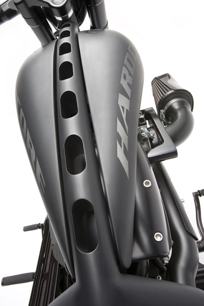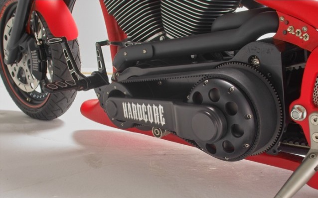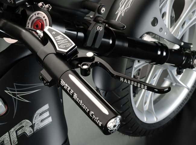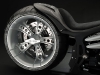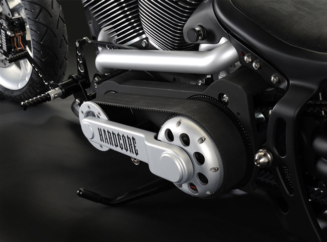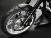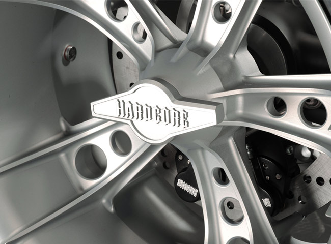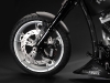 Все детали анодированы, черный цвет даже на перьях вилки. Карбон используется тоже обильно. Хотя, например, переднее крыло здесь не углеродное, как обычно, а полностью стальное. Тормозные суппорты радиального типа с 4-поршнями хоть и украшены логотипом компании, но на самом деле – они специально для Hardcore Cycles выпускаются фирмой Brembo. Головная оптика – единственная серийная деталь – она от «Харлея» V-Rod. Изюминка модели - так называемые, 3D-диски 18 дюймов алюминиевого сплава – дизайн просто шикарный! Они могу быть и черного цвета.