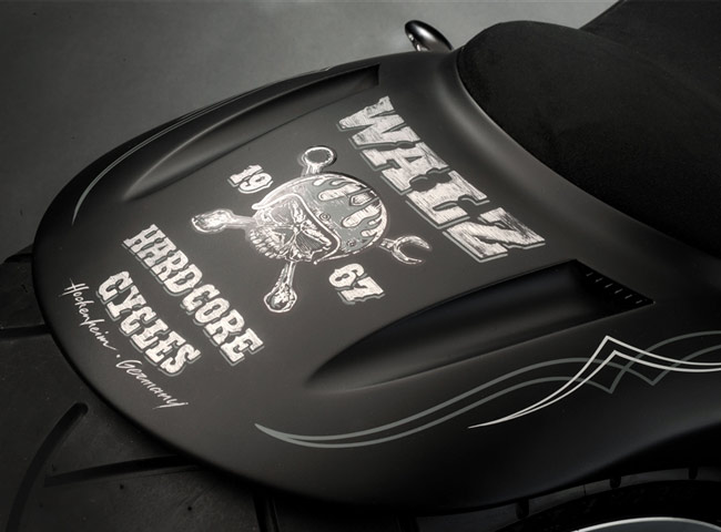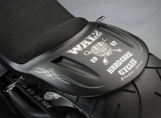 Маркус Вальц давно перешёл в разряд кастомайзеров-звёзд. Подобный статус как известно просто так не получается – для этого необходимо мало того что качественно выполненные работы, но и собственный стиль, а этого немецкому мастеру не занимать. Ещё в начале десятилетия молодой кастомайзер с вызывающей внешностью ворвался на европейскую сцену со своими агрессивного вида и содержания мотоциклами, характерными заниженным седлом, драгстерной посадкой и специфическими колёсами, которые для него изготавливала компания Rick’s. Имя для своей компании Маркус выбрал очень актуальное и удачное Walz Hardcore Cycles. Мотоциклы с подобным силуэтом строили и раньше, но только Вальц сделал их своей «фишкой» и после запуска в серию рамы и шасси под названием Le Mans в Европе началась хардкормания. Маркуса копировали, ему подражали в манере одеваться, в общем он стал настоящей мотоциклетной звездой.