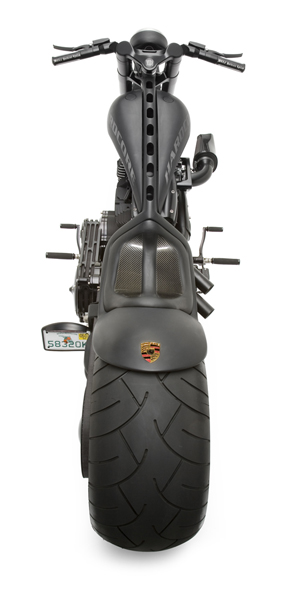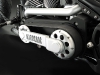 Avalanche сделан из узлов, которые делает и продает компания Маркуса. Никаких собирательств! Все эксклюзивное, настоящий мелкосерийный «hand-made». Так, шасси построено по мотивам его нашумевшего старого проекта Rampage: кит шасси как раз от этого мотоцикла. Размеры колесной базы в 1780 мм долго подбирались для оптимальной управляемости и стабильности мотоцикла на любой скорости. С той же целью оптимизировалась эргономика – подножки, руль… – все настраивается индивидуально под пилота. Высота по седлу – 470 мм, а его форма… Ну собственно, вы видите на снимках. Также на фото обращает на себя внимание гигантский задний «каток». Не секрет, что от геометрии задней подвески и шины зависит много при езде. Именно поэтому Маркус потратил немало времени на поиск оптимальной покрышки, и в итоге задний колесный диск Avalanche украсила широченная низкопрофильная шина в 360 мм! У модели куча фирменных оригинальных решений. Так, масляный бачок находится… в нижнем спойлере-плуге! Маркус уверяет, что такое расположение оптимально для развесовки и понижения центра тяжести, и для охлаждения.