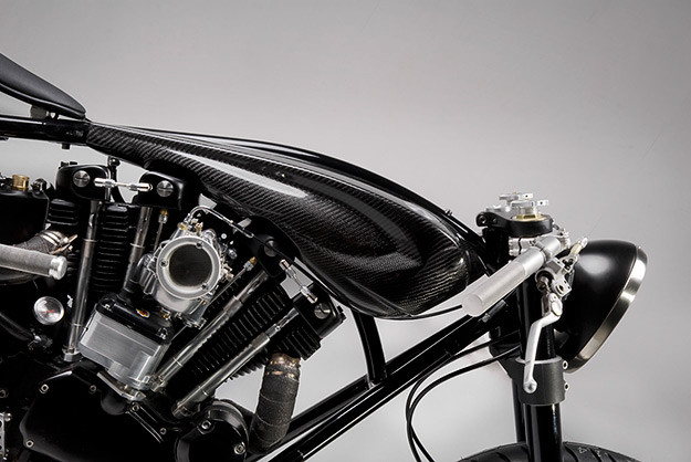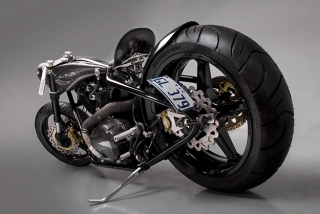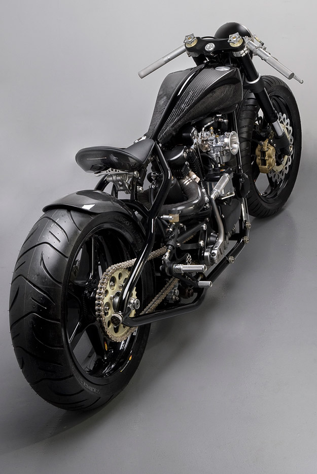 Сразу и не скажешь, что этот удивительный кастом построен на базе классического «Харлея» Он действительно отличается от большинства машин с кастом-шоу с привычными V-образными двигателями. Новый подход в деле кастомайзинга от Дилана – это новые материалы и концепция. Большинство деталей выполнены из карбона вручную и не удивительно, что этот монстр весит всего 162 кг. А двигатель у него от XLCH 1969 года! Дилан его полностью восстановил и «зарядил». Система питания посредством карбюратора S&S Super E. КПП находится слева. Формы стальной рамы необычны и заметим – рама эта покрыта черным карбоном! Переднюю часть украшает переделанная в пух и прах вилка от Ducati 916. Колеса тоже карбоновые – они разработаны в мастерской Blackstone Tek. Тормоза от Brembo.