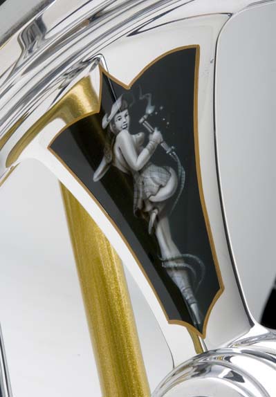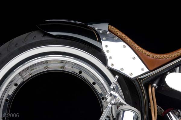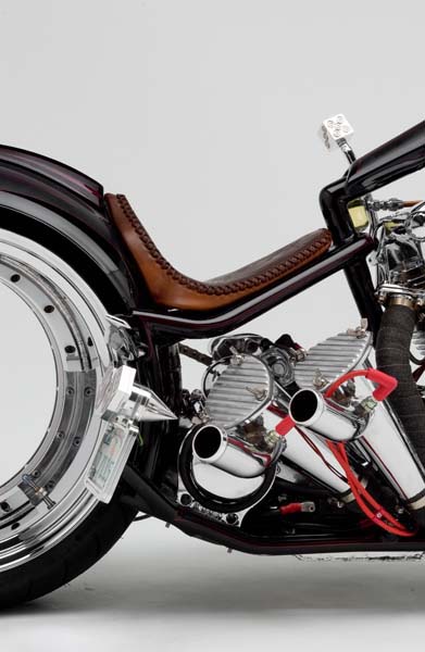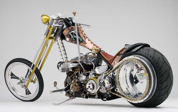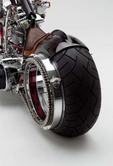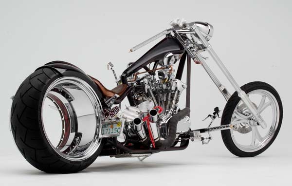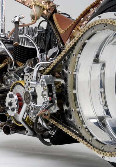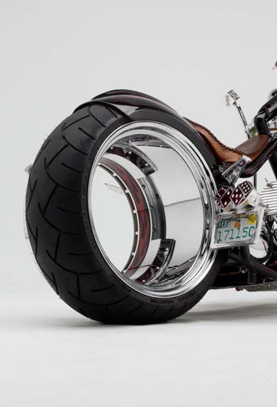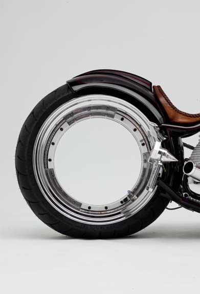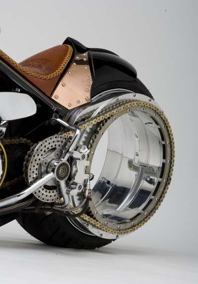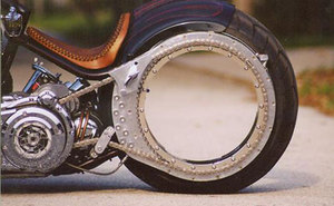 Надо сказать, что в отличие от мотоциклов Билли Лэйна: "The Chronic", "Camel Bike" и Майка Брауна - "Hubless Monster", возможны и другие варианты привода заднего колеса, когда оно приводится в действие без помощи цепи, которая натягивается по всему ободу заднего колеса, потом либо прикрывается, либо нет декоративными панелями. Дело в том, что иной задний привод кардинально отличается от вышеупомянутых и представляет собой систему зубчатых валов. То есть, по всей ширине внутреннего пространства заднего колеса нанесены резцы, приводом служат два малых вала, на которых, в свою очередь, находятся зубцы. Эта схема отдаленно напоминает механизм часов.