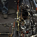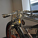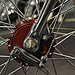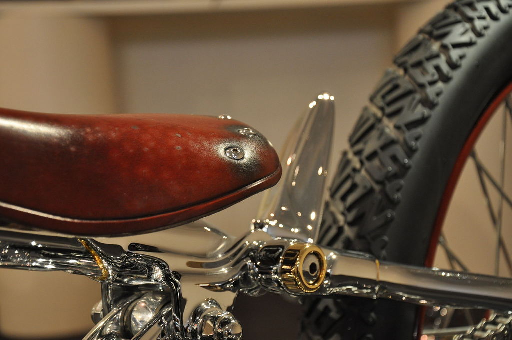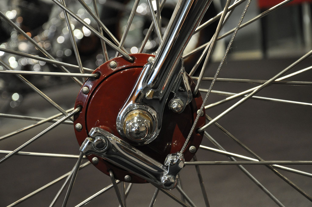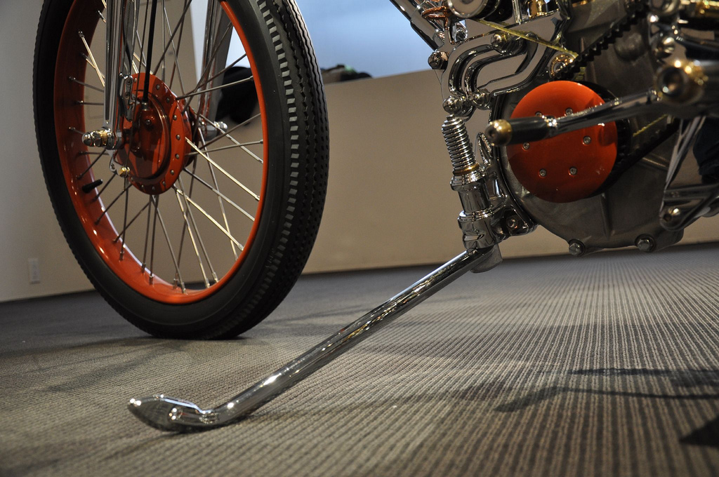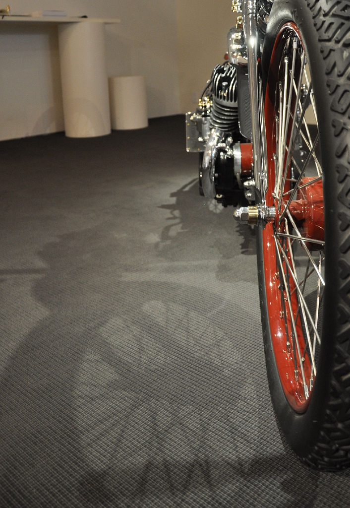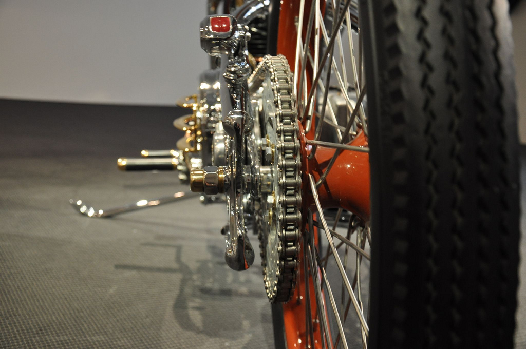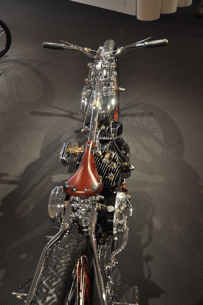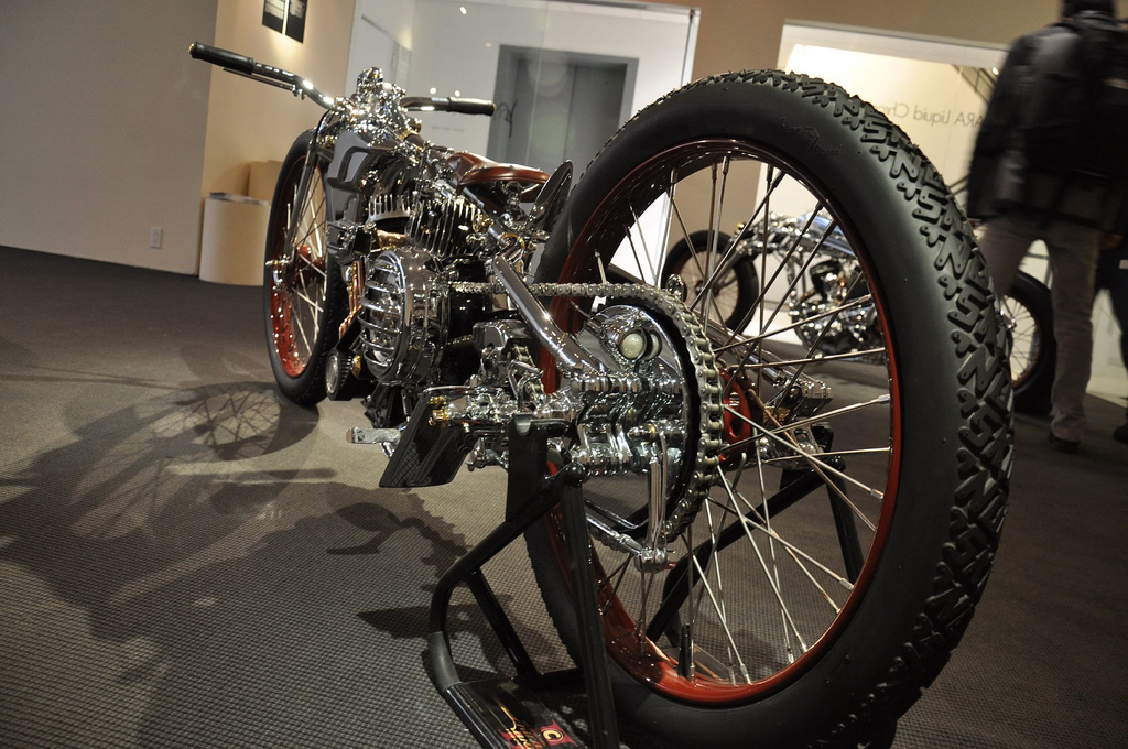 Настоящей находкой японца стало использование огромных 28 дюймовых тонких колёс. На их фоне рама и двигатель стали смотреться прямо таки неестественно игрушечными, чего в общем и добивался мастер, а диаметр переднего колеса ещё более подчёркнут крошечным размером барабанного тормоза.