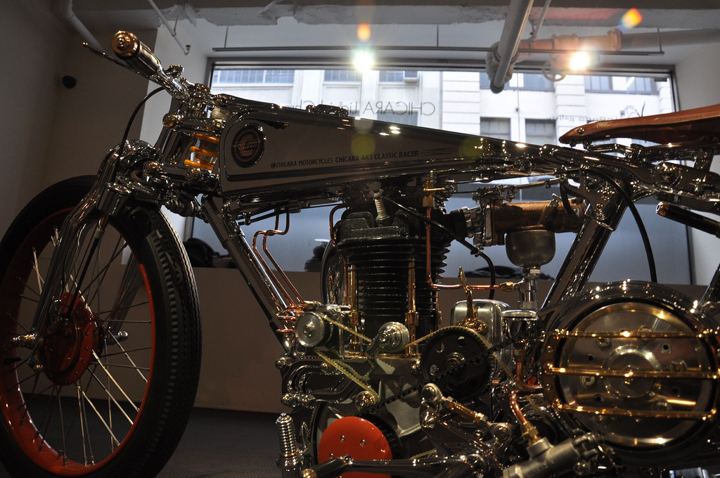 Конечно, мотоциклы Chicara Art можно назвать непрактичными, но они так созданы. Например, посмотрев на Art III Classiс, здесь вилка присоединена к раме гибкой сцеплением, которое разместилось на амортизаторе. Это определенно означает, что Chicara при проектировании байков не думал о том, чтобы на них ездить, а также не думали об их эффективности. Они – предметы искусства. Мотоциклы имеют красивые медные и латунные вставки, а когда вы сконцентрируетесь на любой из моделей, вы начнете понимать, насколько эти проекты ушли далеко вперед. Ранние модели Харлеев, модели двигателей прошлого века – сегодня все это превратилось в современный высокотехнологичный механизм. Прошлые красоты воссозданы в новых конструкциях, и это была основная цель Чикара Нагаты.