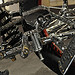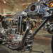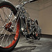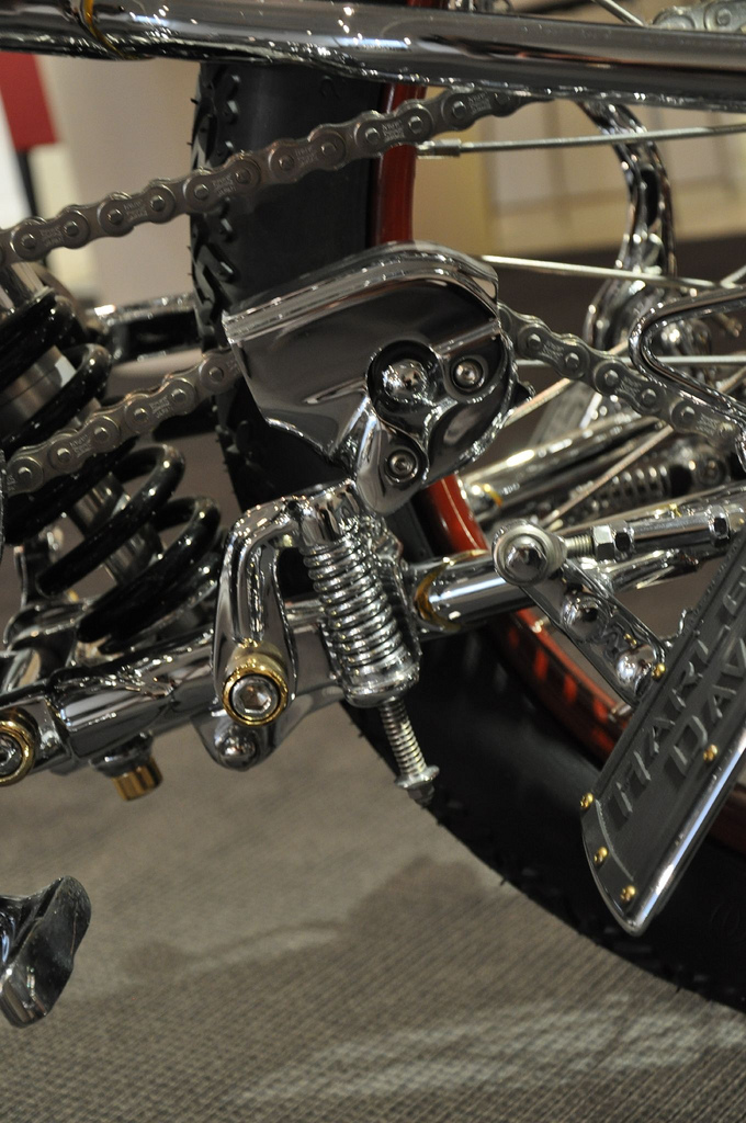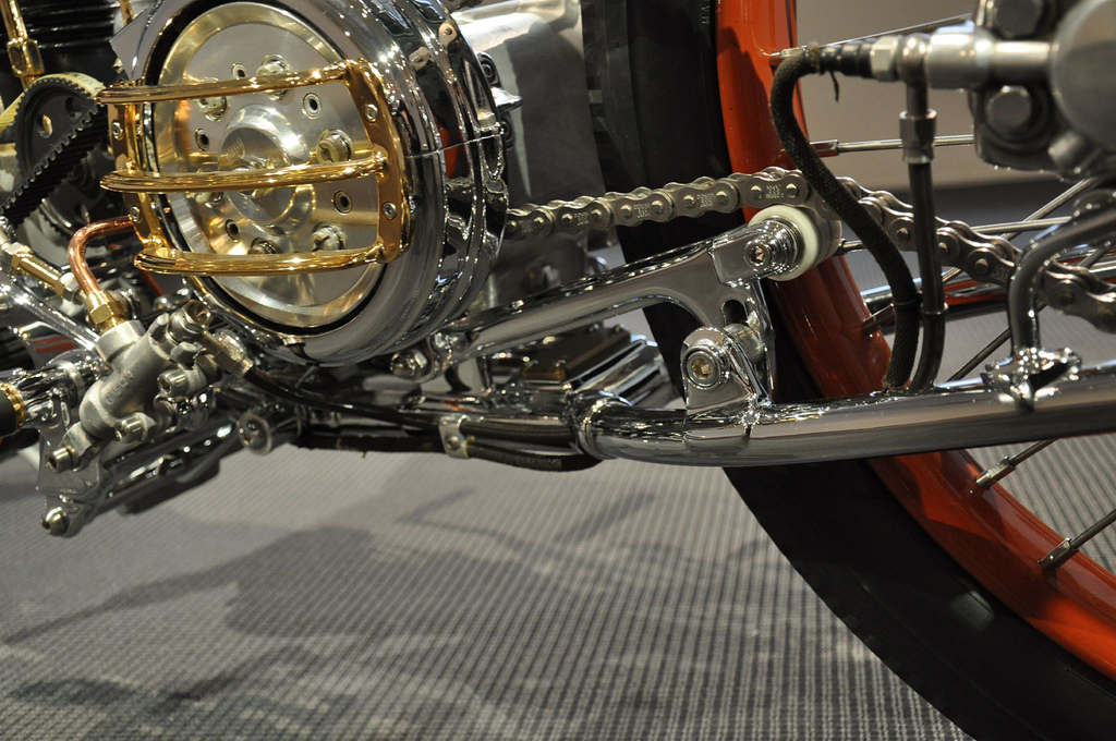 школа здесь во всей красе! А что же вы, драгстер ждали? МИНИМАЛИЗМ чётко и ясно прописано в каждом узле, в каждой детали этого мотоцикла. Но как это всё работает, пыхтит и двигается всё равно до конца не понятно. Вряд ли Чикара в принципе долго думал о ходовых качествах нового мотоцикла, сомневаюсь, что планировал изнурительные тестдрайвы и не спал ночами беспокоясь об удобстве ягодиц ездока, так что тут не обессудьте, всё же в названии сказано – «искусство»! Рама с её ничем непрерываемой прямотой линий умудрилась ещё и быть укомплектованной подвесками, как передней, так и задней. Жёсткая вилка соединена с мотоциклом четырьмя рычагами и амортизатором, которые «отрабатывают» при попадании мотоцикла на неровность. Ничего не буду говорить про работоспособность конструкции, помните ведь, «art». Задний амортизатор так тщательно замаскирован, что не даёт усомниться зрителю в «сухости» рамы, а между тем, это вполне рабочая, даже без поправок на выставочное призвание