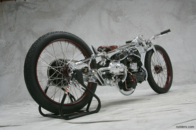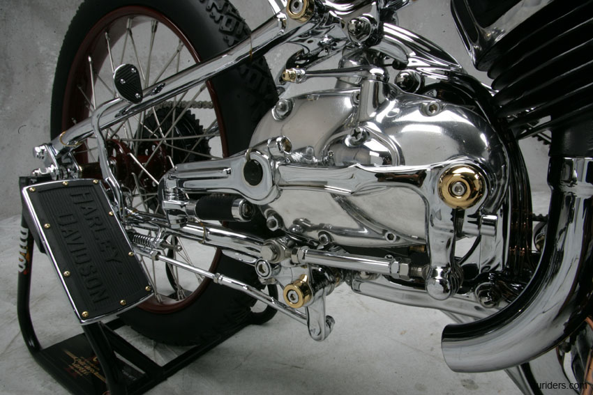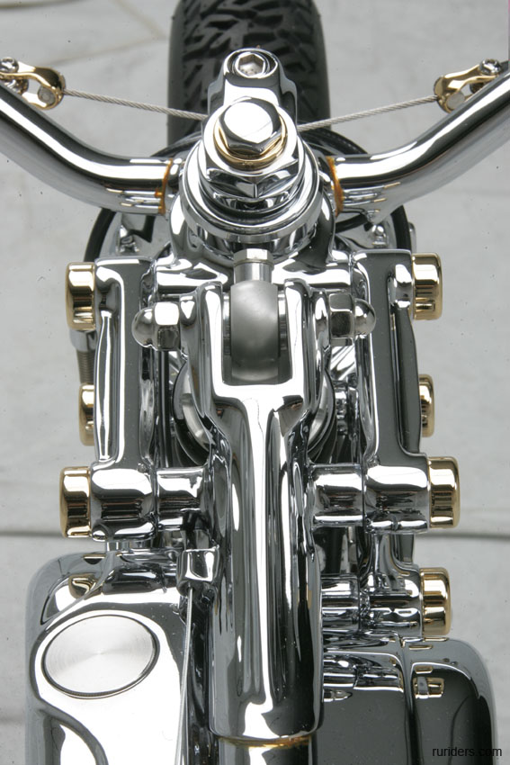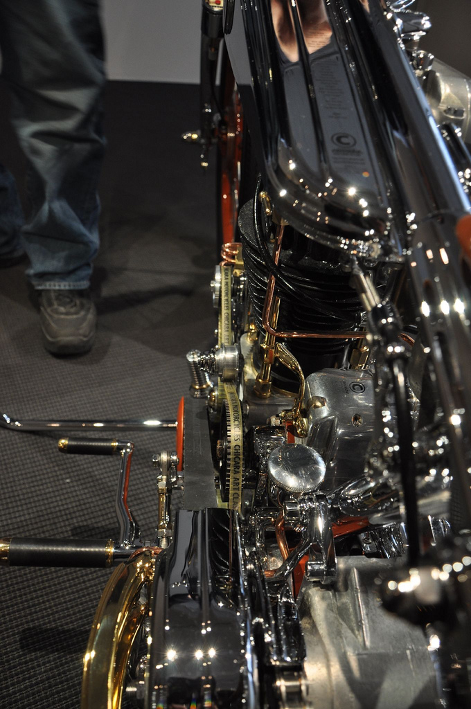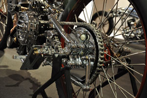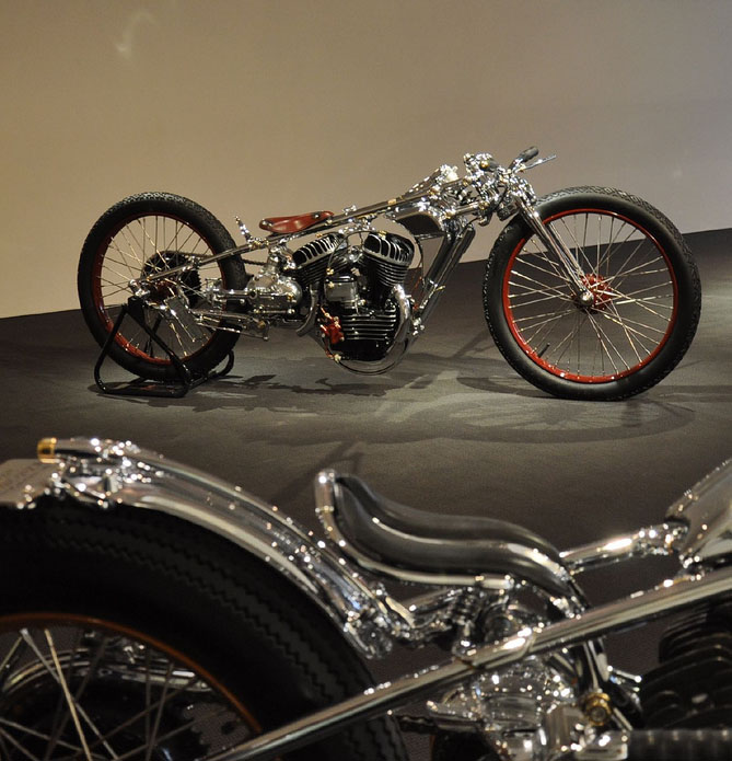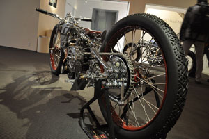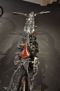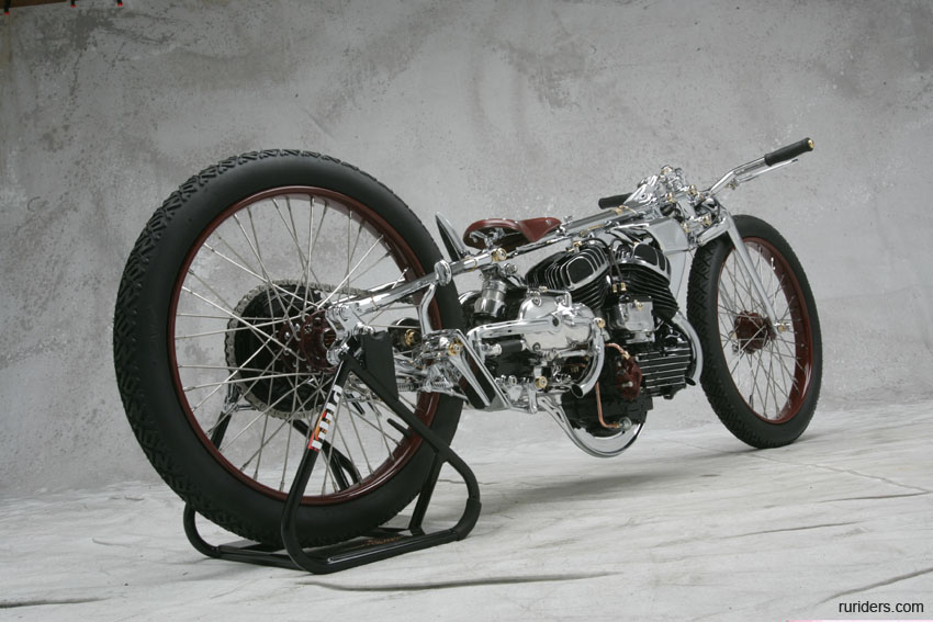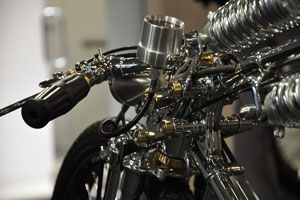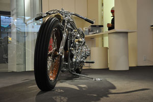 Мотоцикл-победитель Чемпионата Мира 2006 от титулованной японской мастерской Chicara Art покорил судей и зрителей стильной хромированной рамой с параллелограммной вилкой и антикварным мотором от Harley-Davidson модели U аж 1937 года выпуска. Проработка деталей - выше всяких похвал! Рама типа «гуснек» давно уже считается коньком японских мастеров, но у Чикаро Нагаты «гусиная шея» - отдельный элемент конструкции, изящно приваренный к основной, «короткошеей» раме. И это только одна из многочисленных «фишек».