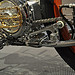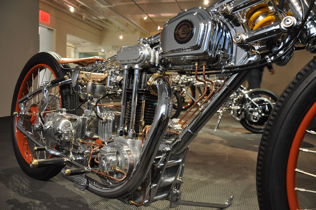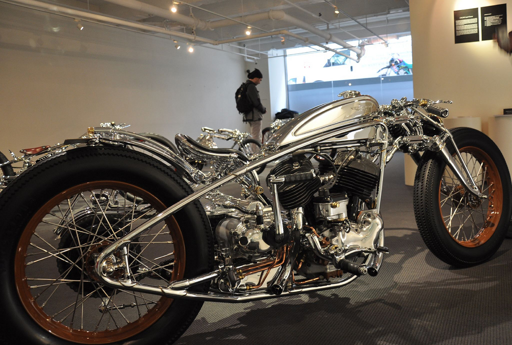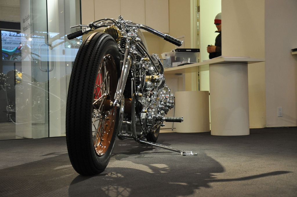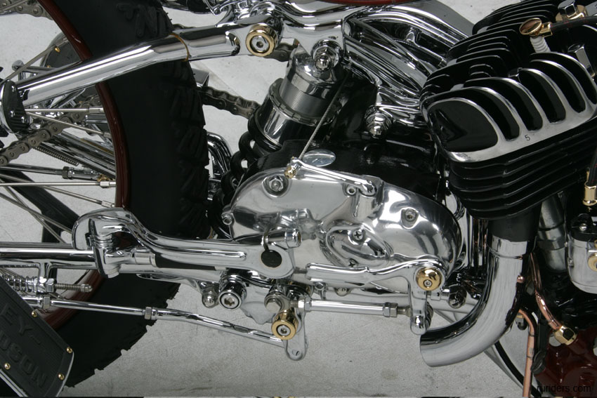 мотоцикла, конструкция. Внутри треугольника рамы компактно уместился Flathead от WLA 1942 года объёмом 45”. Эдакое чёрное пятно, он контрастирует с полированной рамой и от этого особенно хорошо смотрится. Огибающая его снизу рама – вообще загляденье, в частности благодаря высоко посаженной 4-х ступенчатой коробке передач от Triumph 1960-го года выпуска.