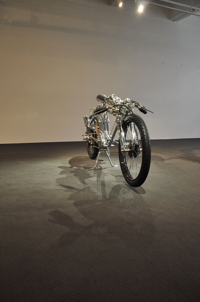 «Chicara Art Three» продукт 2008 года, основанный на модели 1950 года Meguro Racing Motor. Двигатель объемом 496.5 куб. см выдает 28 л.с. при 5500 оборотах. Он оснащен верхним расположением клапанов. Он также имеет зажигание Moris Magnetto и карбюратор от Linkert, Chicara поставил свою крышку карбюратора и выхлопную трубу. Масляный насос от Honda XR250, а коробка передач от 1950 Triumph. Мотоцикл оснащен 4-скоростной коробкой передач. Двигатель Sprocket от Bob Newby Racing. Байк построен на базе жесткой рамой с вилкой ручной работы. Амортизаторы от Ohlins и передняя подвеска являются подлинниками. Кроме того, ручной тормоз, ручное сцепление, комплект контроля заднего тормоза, устройство контроля ножного переключателя – все сделано в мастерской Chicara Motorcycles. По внешнему виду можно понять, что бензобак, масляный бак, рулевое управление, фара, первичное покрытие, тормозные рычаги и сцепление, резервный масляный бак, задний фонарь, комплект натяжения ремня и цепи, рычаг переключения передач, а также подножки – художественная разработка автора. Переднее и заднее колеса – MTR-Cycle, обе шины – Coker Classic размером 28"х3". А как вам художественные работы Junya Tsugama?