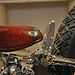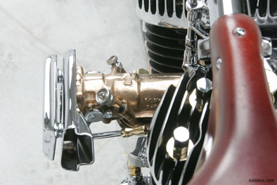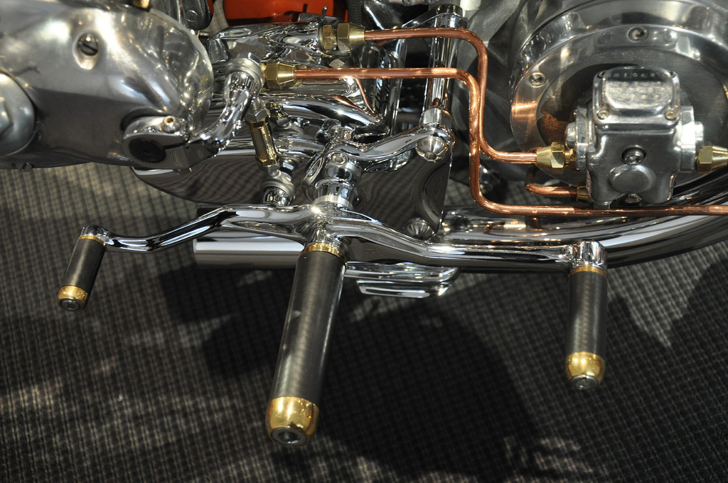 Делать кастом с обычным бензобаком пошло, поэтому Чикара соорудил мультифункциональную конструкцию, закреплённую спереди рамы и снабжающую мотор всеми необходимыми жидкостями, то есть и маслом и бензином. Эта ёмкость похожа на что угодно только не на бак и с успехом выполняет роль очередного арт-объекта, как впрочем и медные трубки, по которым к двигателю поступают смазка и топливо. Магнето в этом мотоцикле было скорее необходимостью, потому как кроме своей «олдскульности» оно ещё и избавило Чикару от необходимости искать место под аккумулятор, что для этого проекта очень не лишне.