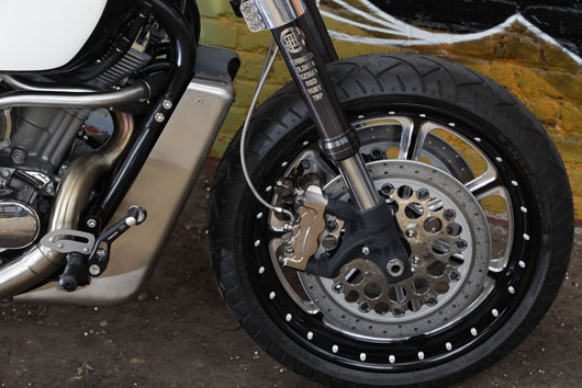Колеса от V-Rod, шины от Dunlop, 120 х 180. Руль обычный Beringer доработанный Krugger'ом. Тормоза Beringer, два 6-поршневых спереди и один 6-поршневой суппорт на заднее колесо. Полоски стали плетеные.