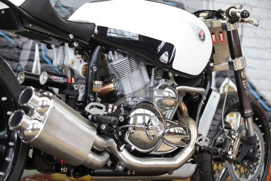 Только двигатель (Buell) и колеса (Harley-Davidson V-Rod) были использованы в качестве донора, все остальное сделано Фредом. Как настоящий боец, когда дело касается строительства мотоциклов, он становится адским сварщиком.