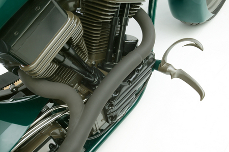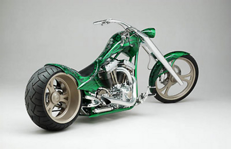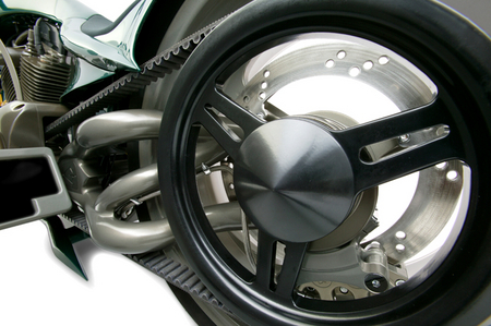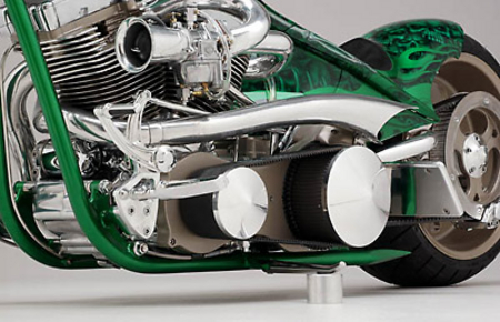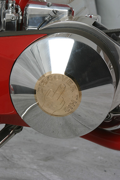 Но что же так поразило судей и коллег Голдаммера в мотоцикле, получившем звонкое имя Goldmember? А то, что и всегда поражает в работах Роджера – потрясающая технологичность, инновационность и, не побоюсь этого слова, революционность. Здесь снова не обошлось без излюбленного трюка кастомайзера – отрезания переднего цилиндра тюнингованного харлеевского двигателя и пересадки на его место заднего. Освободившееся место также традиционно занял чарджер, а вот что касается системы впрыска – тут появилось кое-что новое, а точнее возможность одним нажатием кнопки оставить всех соперников позади, впрыснув в камеру сгорания немного окисленного азота. Кроме того для достижения наилучших спортивных результатов, Роджер изобрёл и изготовил собственный распредвал и минимизировал возможность ошибки пилота с помощью установки электрического переключателя скоростей.