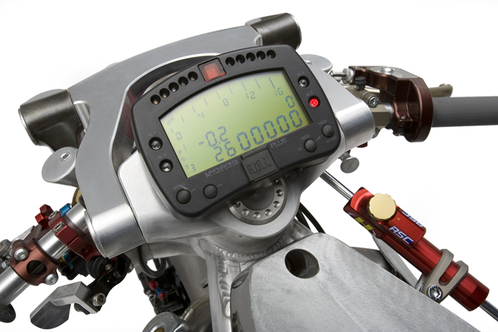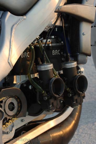 Like it's Honda inspiration, "ExperiMental" is a two-stroke. Nestled inside the one-off frame Goldammer sources a BRC 250cc superkart motor. "It's an Aprilia Rotax designed Tandem-Twin, two cylinders - one in front of the other - and two crankshafts geared together," said Goldammer as he and his crew were playing with the engine's high-tech electronic equipment and data acquisition to dial in the maximum horsepower output. Goldammer had just returned from his initial Bonneville run and believed the engine, which is the dominating powerplant in superkart racing, was capable of some more steam.